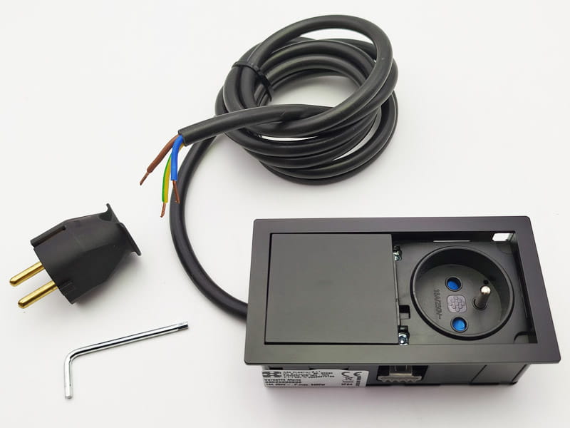 Konstrukcja modułu zapewnia ochronę na poziomie IP54, gwarantując szczelność ochrony w środowiskach narażonych na bryzgi czy wilgoć — pod warunkiem użycia zamkniętej pokrywy. Typowe wymiary gniazda (dla wersji standardowej) to około 123 x 66 x 42,5 mm, co pozwala na wygodny montaż wpuszczany w litym blacie meblowym lub w specjalnych panelach meblowych.
