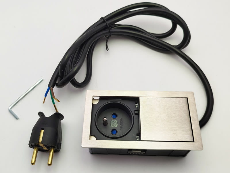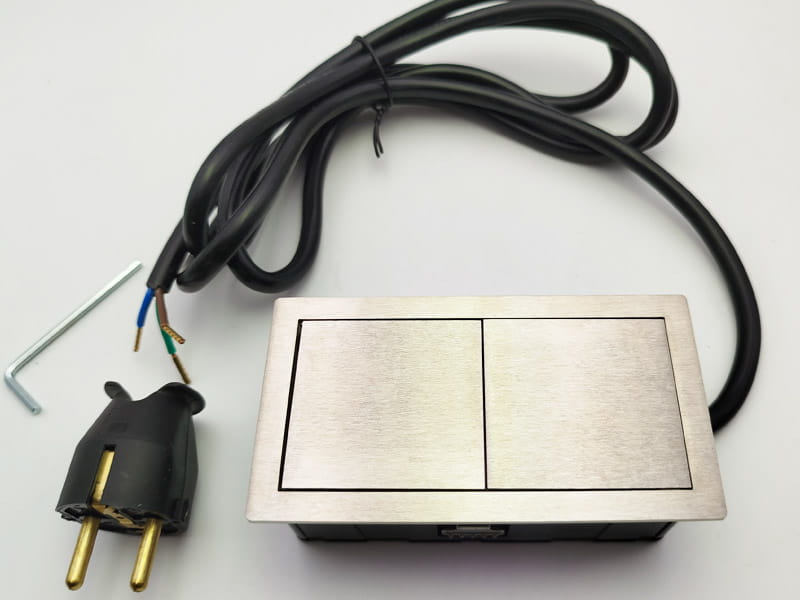 Konstrukcja modułu zapewnia ochronę na poziomie IP54, gwarantując szczelność ochrony w środowiskach narażonych na bryzgi czy wilgoć — pod warunkiem użycia zamkniętej pokrywy. Typowe wymiary gniazda (dla wersji standardowej) to około 123 x 66 x 42,5 mm, co pozwala na wygodny montaż wpuszczany w litym blacie meblowym lub w specjalnych panelach meblowych.