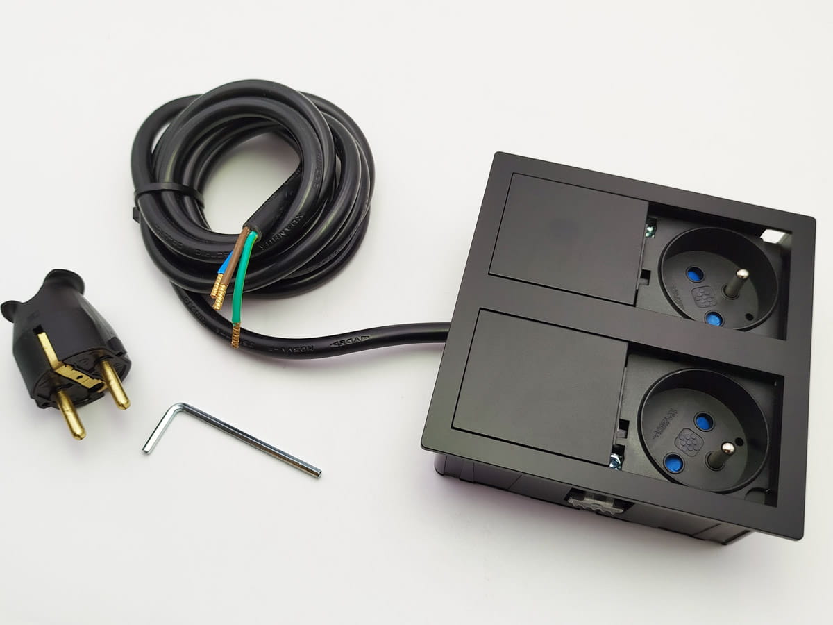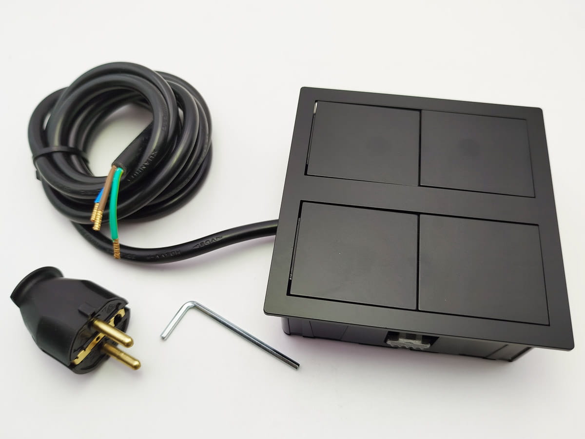 Konstrukcja modułu zapewnia ochronę na poziomie IP54, gwarantując szczelność ochrony w środowiskach narażonych na bryzgi czy wilgoć — pod warunkiem użycia zamkniętej pokrywy. Typowe wymiary gniazda (dla wersji standardowej) to około 117 × 117 × 42,5 mm, co pozwala na wygodny montaż wpuszczany w litym blacie meblowym lub w specjalnych panelach meblowych.