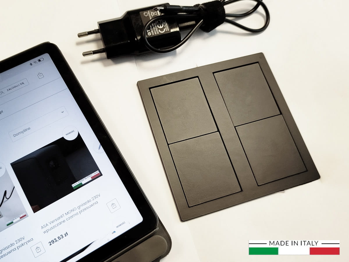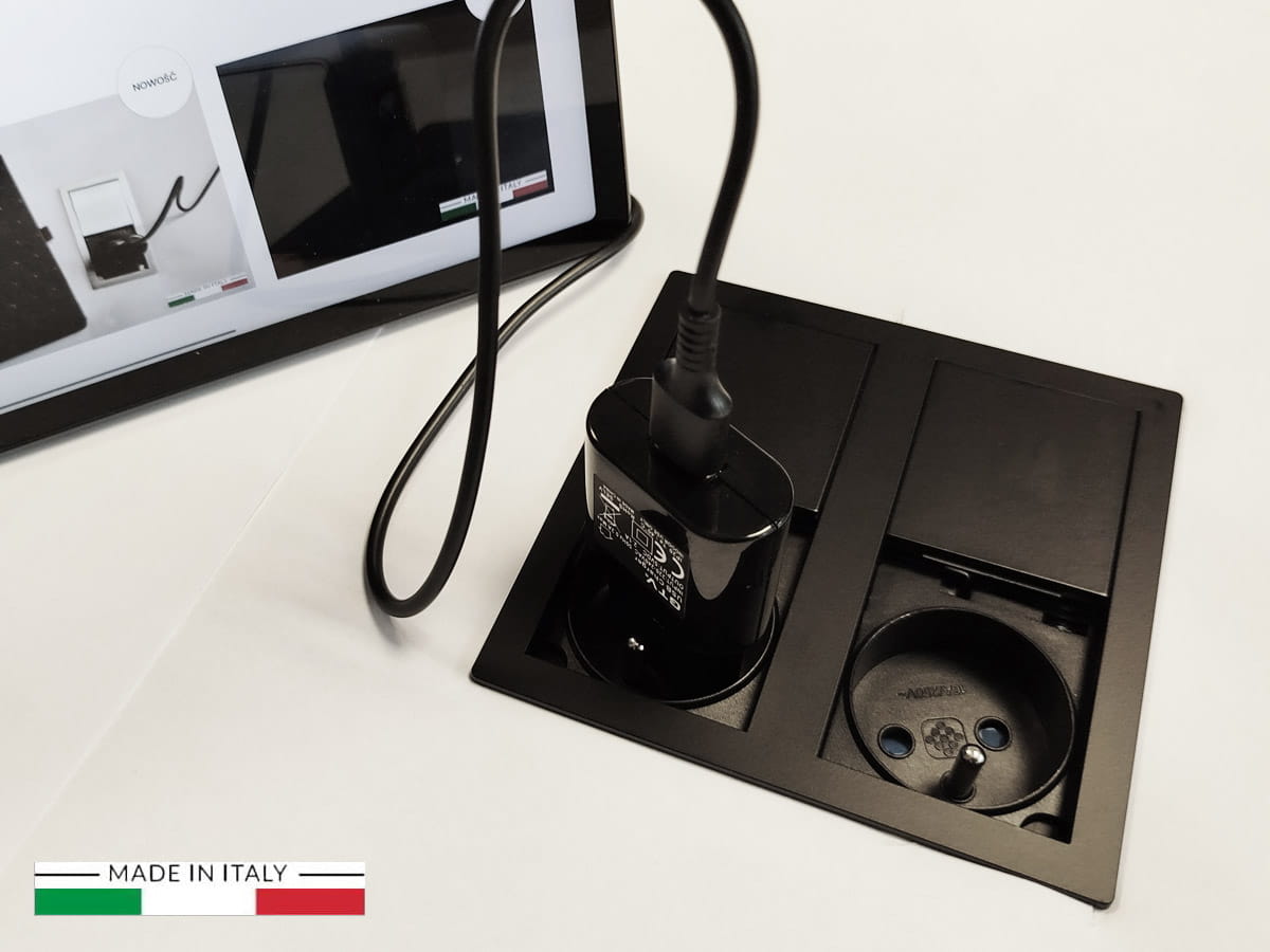 Gniazdo VersaHIT to wysokiej klasy, podwójny moduł zasilający, zaprojektowany z myślą o montażu w meblach — szczególnie w kuchennych blatach, stołach konferencyjnych lub eleganckich zabudowach biurkowych. Jego estetyka łączy włoski design z praktycznością zastosowania, a dopracowane detale wykonania świadczą o staranności i jakości marki ASA Plastici.