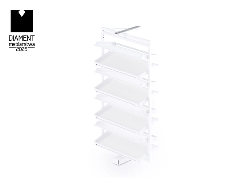 Obrotowa konstrukcja 360° znacząco ułatwia dostęp do każdej półki, podnosząc komfort użytkowania. Dzięki pełnemu obrotowi półek nie musisz sięgać głęboko w kosz, aby odnaleźć swoje buty. Wystarczy obrócić półkę, aby zyskać bezpośredni dostęp do każdej pary obuwia, co sprawia, że organizacja i wybór butów stają się szybkie i wygodne. Ta funkcjonalność jest szczególnie przydatna w wąskich lub głębokich szafach, gdzie dostęp do przedmiotów bywa trudniejszy. Dodatkowo, mechanizm obrotowy działa płynnie i cicho, co zwiększa komfort codziennego użytkowania.