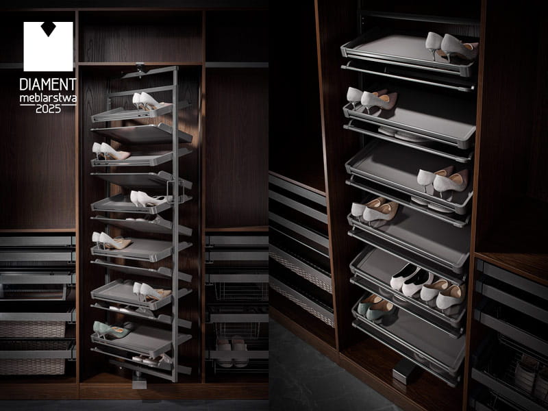 Funkcja pełnego wysuwu zapewnia wygodny dostęp do wszystkich półek kosza na buty. Dzięki tej opcji można w łatwy sposób wyjąć cały kosz, co znacznie ułatwia organizację i porządkowanie obuwia. Pełny wysuw pozwala na szybkie przeglądanie wszystkich par butów oraz ich łatwy wybór. To rozwiązanie jest szczególnie przydatne w głębokich szafach, gdzie dostęp do tylnych półek bywa trudniejszy. Mechanizm wysuwu działa płynnie i cicho, co dodatkowo podnosi komfort codziennego użytkowania kosza.