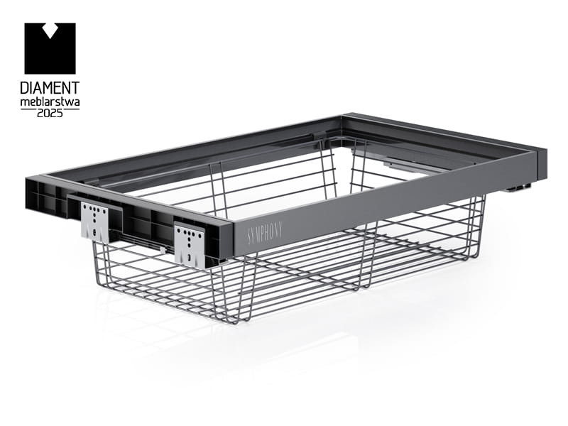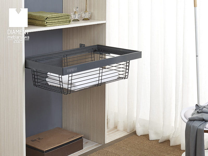 Uniwersalny zaczep umożliwia szybką wymianę kosza na inne akcesoria z serii SYMPHONY, co daje szerokie możliwości personalizacji wnętrza szafy. Funkcja regulacji szerokości ramy pozwala na idealne dopasowanie kosza do każdej garderoby – wystarczy poluzować dwie śruby, przesunąć ramę i ponownie je dokręcić. Mimo swojej lekkości, kosz druciany WB-660 jest niezwykle wytrzymały, o czym świadczy jego maksymalny udźwig do 35 kg. Niezawodność potwierdzają również testy systemu jezdnego obejmujące 60 000 cykli działania.