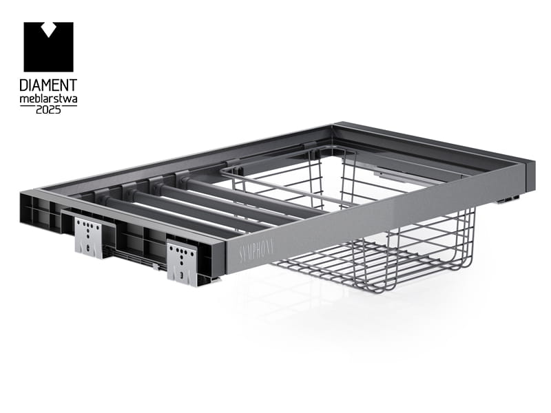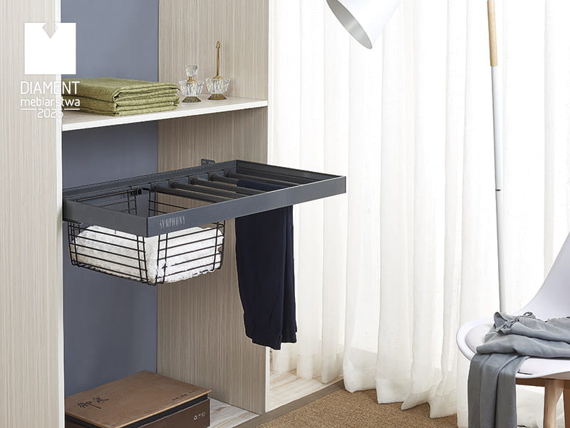 Wieszak na spodnie z koszem WB-663 to funkcjonalne i estetyczne rozwiązanie łączące dwie formy przechowywania – możliwość zawieszenia spodni oraz schowania odzieży lub bielizny w koszu. Dzięki prostemu, nowoczesnemu wzornictwu oraz dopracowanej konstrukcji, doskonale komponuje się z nowoczesnymi wnętrzami, wprowadzając do nich elegancję i świeżość. Dyskretny system dolnego montażu z niewidocznym mocowaniem sprawia, że całość prezentuje się wyjątkowo schludnie i harmonijnie. Zastosowany mechanizm pełnego wysuwu umożliwia całkowite wysunięcie zestawu z szafy, co zapewnia wygodny i szybki dostęp do wszystkich przechowywanych elementów – nawet tych znajdujących się w głębi. Prowadnice gwarantują płynne i stabilne działanie, co przekłada się na komfort użytkowania oraz lepszą organizację przestrzeni. Dla dodatkowej wygody, WB-663 został wyposażony w system cichego domykania, który pozwala na delikatne i bezgłośne zamykanie. To rozwiązanie nie tylko podnosi komfort użytkowania, ale również chroni mechanizmy przed nadmiernym zużyciem i uszkodzeniami. Rama z możliwością regulacji szerokości w zakresie 5 cm (po 2,5 cm z każdej strony) pozwala na łatwe dopasowanie zestawu do różnych szerokości szaf. Uniwersalny zaczep umożliwia sprawną wymianę wieszaka z koszem na inne akcesoria z linii SYMPHONY, oferując elastyczność w aranżacji wnętrza garderoby. Model WB-663 cechuje się wysoką nośnością do 35 kg, co gwarantuje bezpieczne przechowywanie odzieży bez ryzyka przeciążenia konstrukcji. Trwałość systemu potwierdzają testy wytrzymałościowe – 60 000 cykli pracy, które zapewniają niezawodne działanie nawet przy częstym i intensywnym użytkowaniu.
