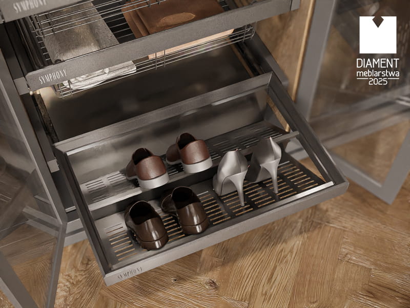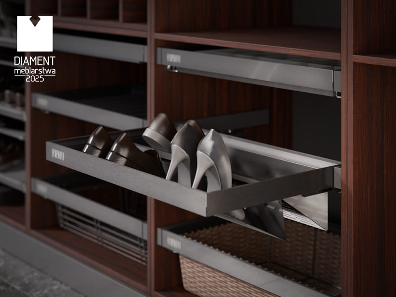 Dzięki systemowi pełnego wysuwu, kosz można całkowicie wysunąć z szafy, co znacznie ułatwia dostęp do przechowywanego obuwia. Cichy domyk eliminuje hałas podczas zamykania, chroni konstrukcję przed uszkodzeniem i zwiększa komfort codziennego użytkowania.