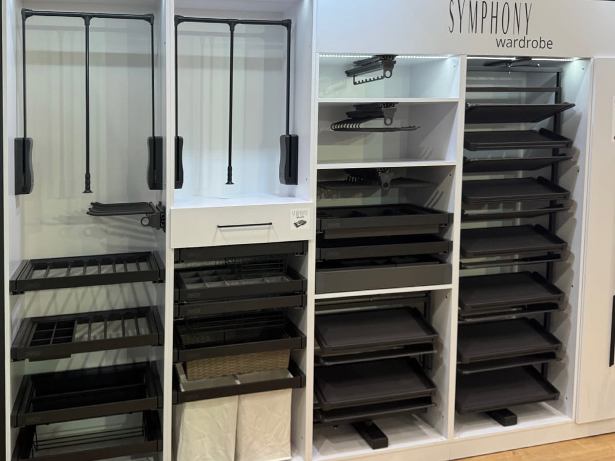 Model WB-672 z serii SYMPHONY oferuje także regulację szerokości ramy w zakresie 5 cm (po 2,5 cm z każdej strony), co pozwala na idealne dopasowanie do różnych rozmiarów szaf. Uniwersalny system montażu umożliwia szybką i łatwą wymianę akcesoriów w ramach tej samej serii.