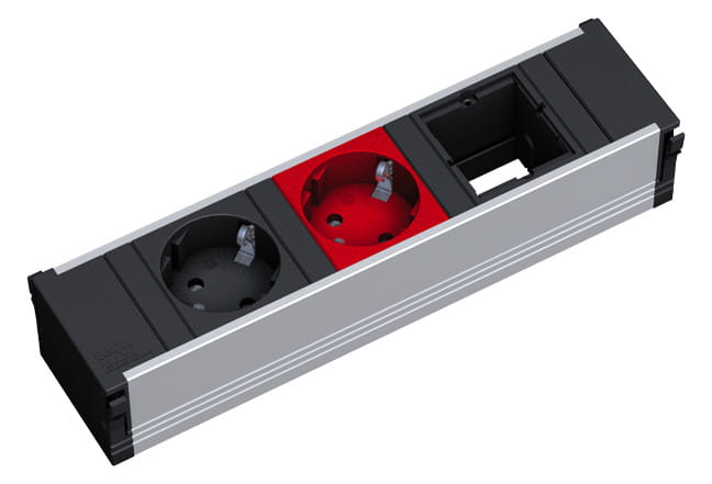 - Listwa zasilająca typu CONI 3-modułowa: 1 gniazdo Schuko z uziemieniem + 1 gniazdo Schuko CZERWONE z uziemieniem + 1 gniazdo wolne (na własne moduły użytkownika, patrz produkty powiązane)