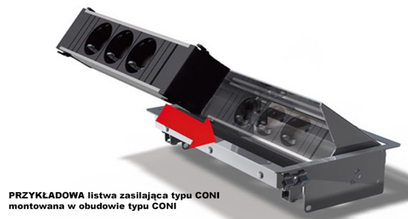Gdy nie jest używany, moduł CONI zlicowany jest z blatem stołu, czy biurka. Gdy tylko potrzebny jest dostęp do zasilania sieci, czy innych mediów po prostu wystarczy otworzyć pokrywę, by uzyskać dostęp do wymaganych gniazd. Zintegrowana osłona szczotkowa zabezpiecza przewody przez poplątaniem.
