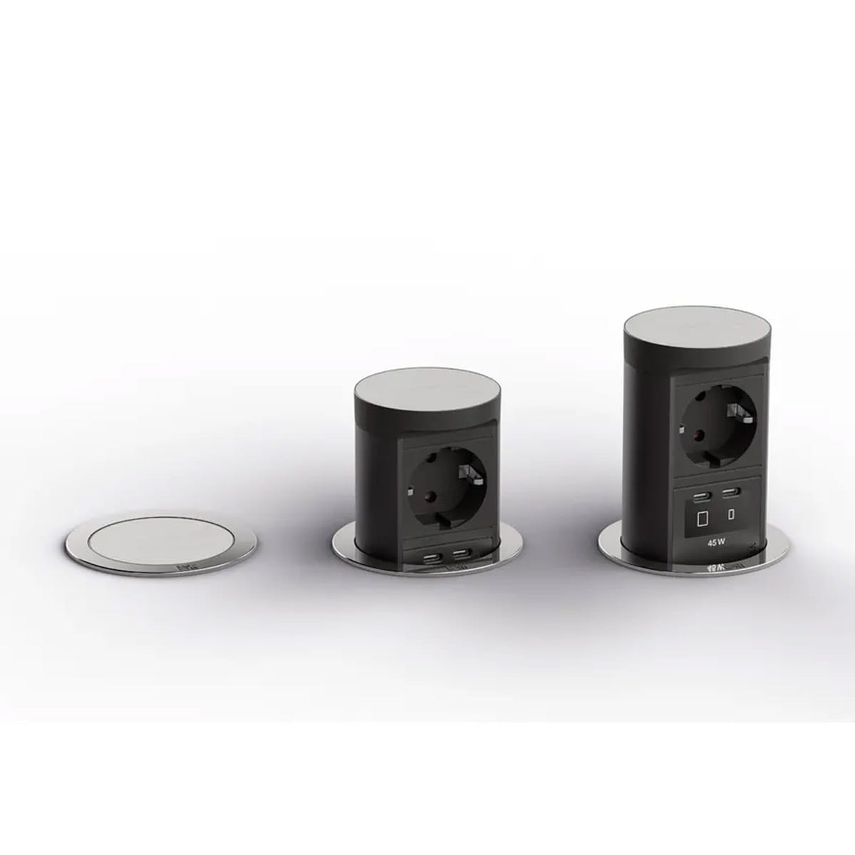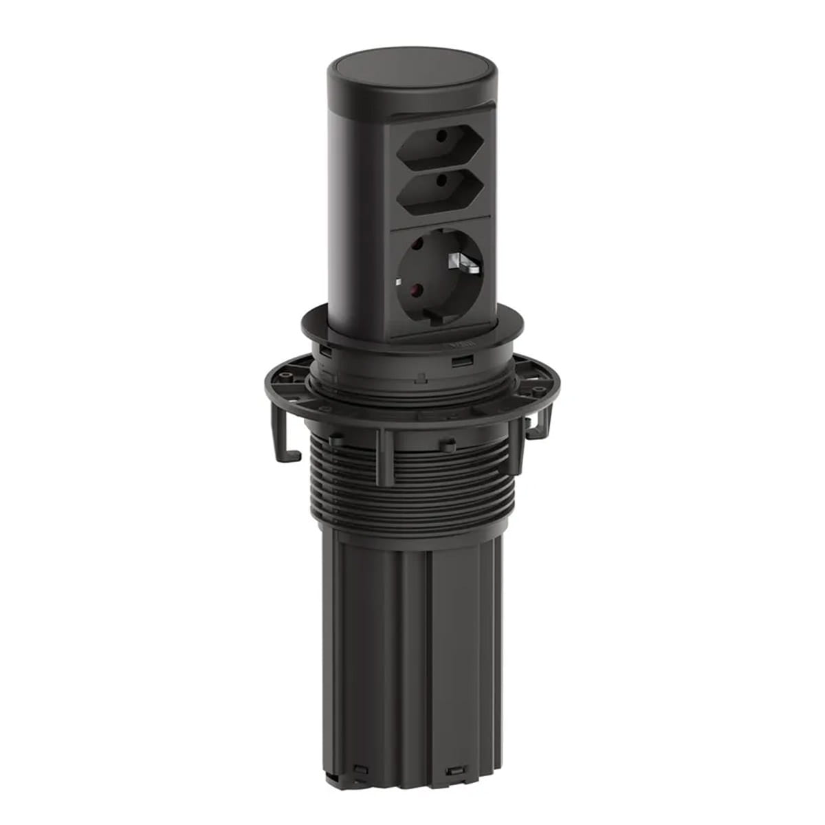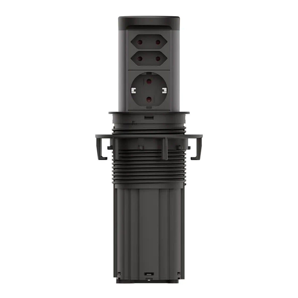 Model Bachmann BM0020498 to wysuwane gniazdo blatowe z serii ELEVATOR 2, przeznaczone do montażu w biurkach lub blatach kuchennych. Po naciśnięciu pokrywy moduł wysuwa się nad powierzchnię, a po użyciu można go schować, co zapewnia estetykę i oszczędność miejsca.