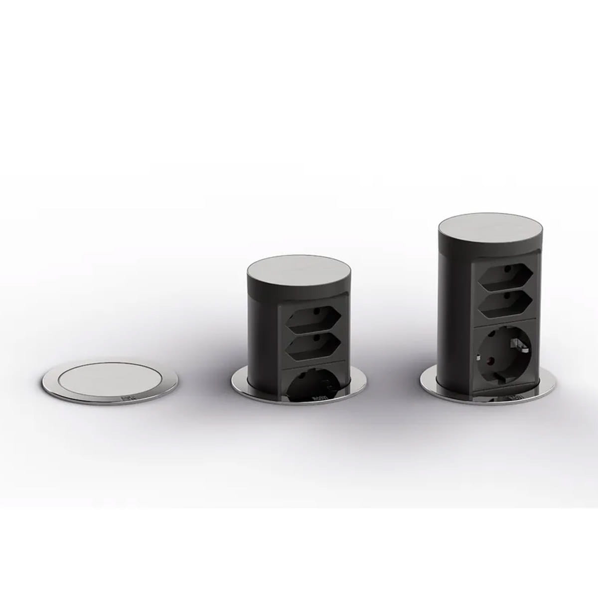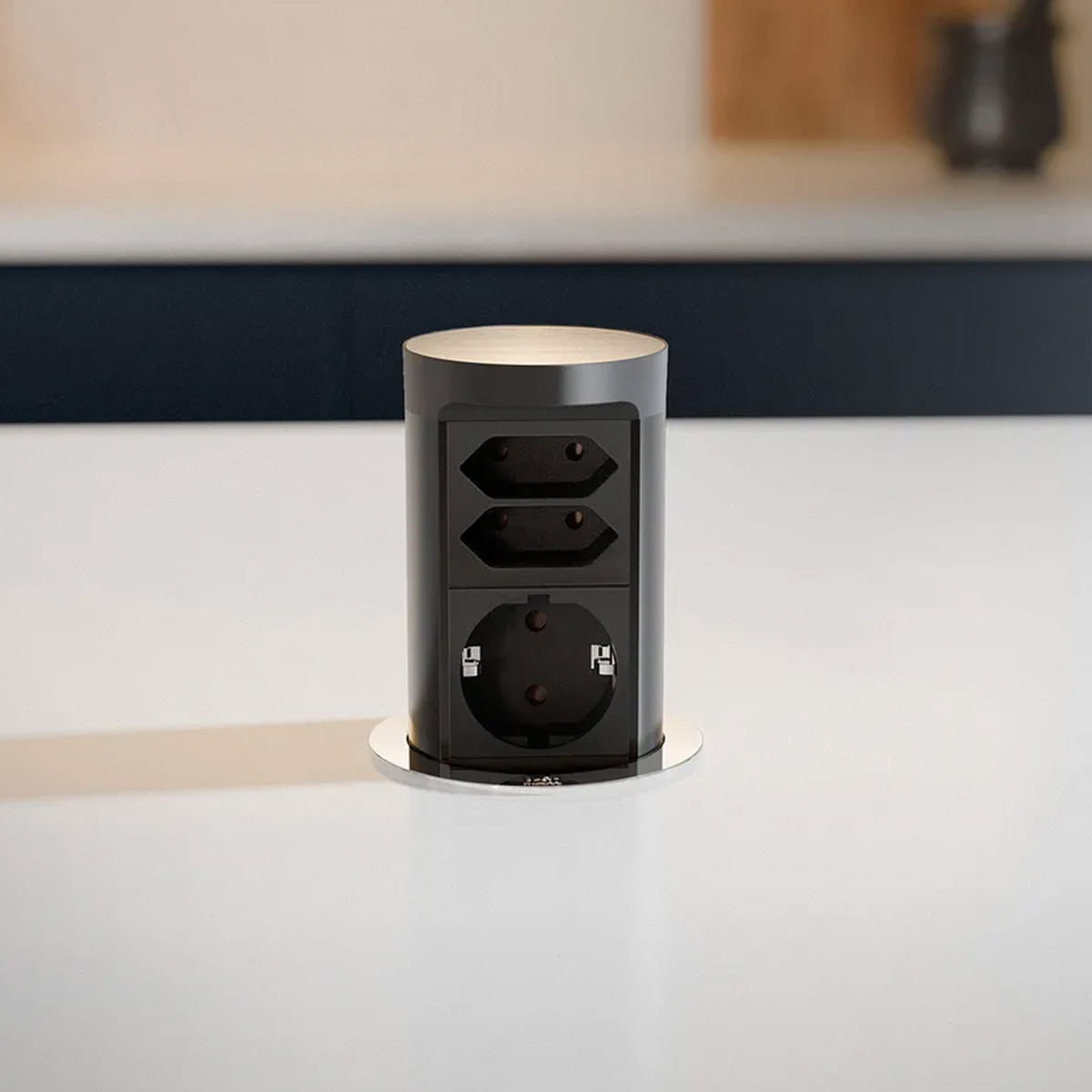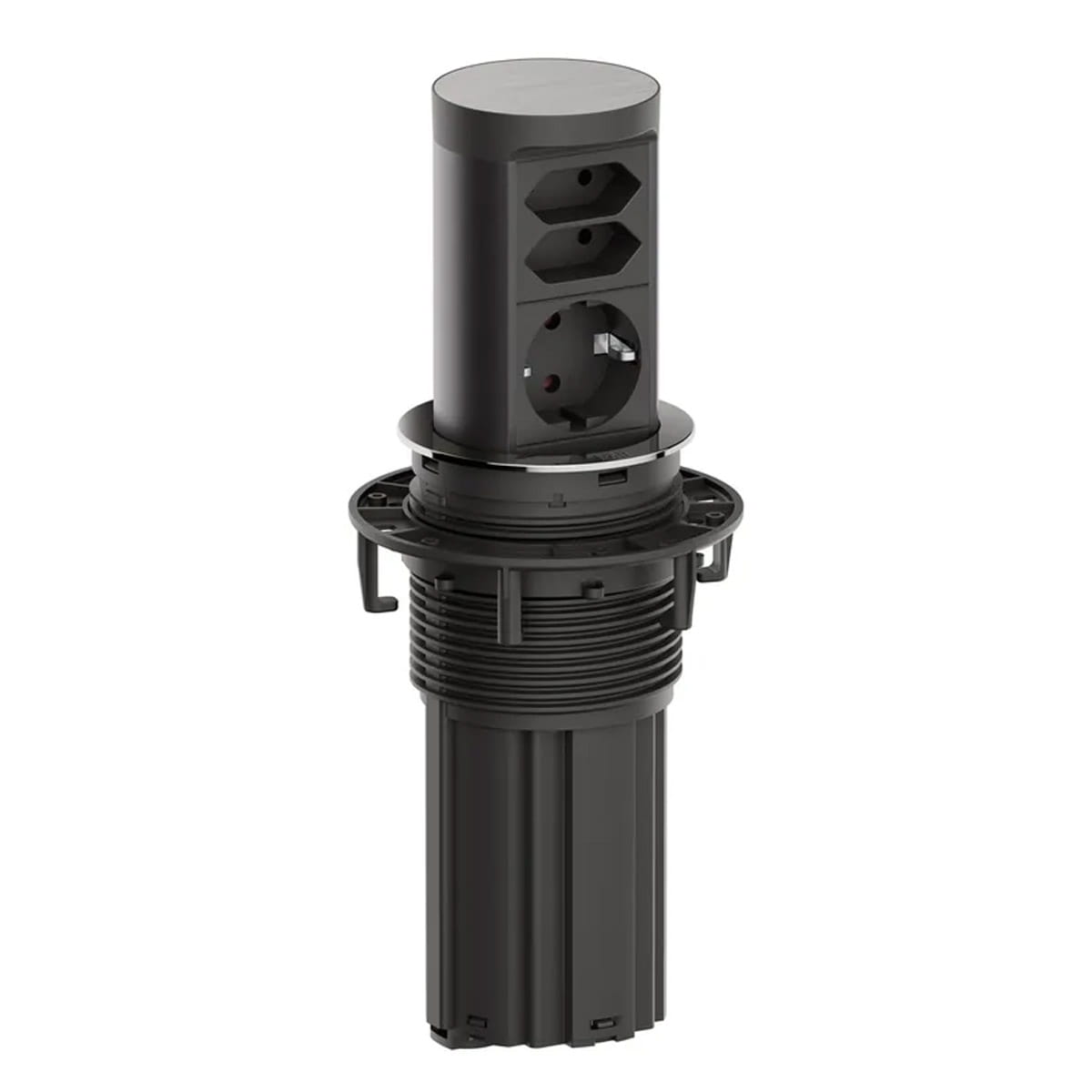 Model Bachmann BM0020489 to wysuwane gniazdo blatowe z serii ELEVATOR 2, przeznaczone do montażu w biurkach lub blatach kuchennych. Po naciśnięciu pokrywy moduł wysuwa się nad powierzchnię, a po użyciu można go schować, co zapewnia estetykę i oszczędność miejsca.