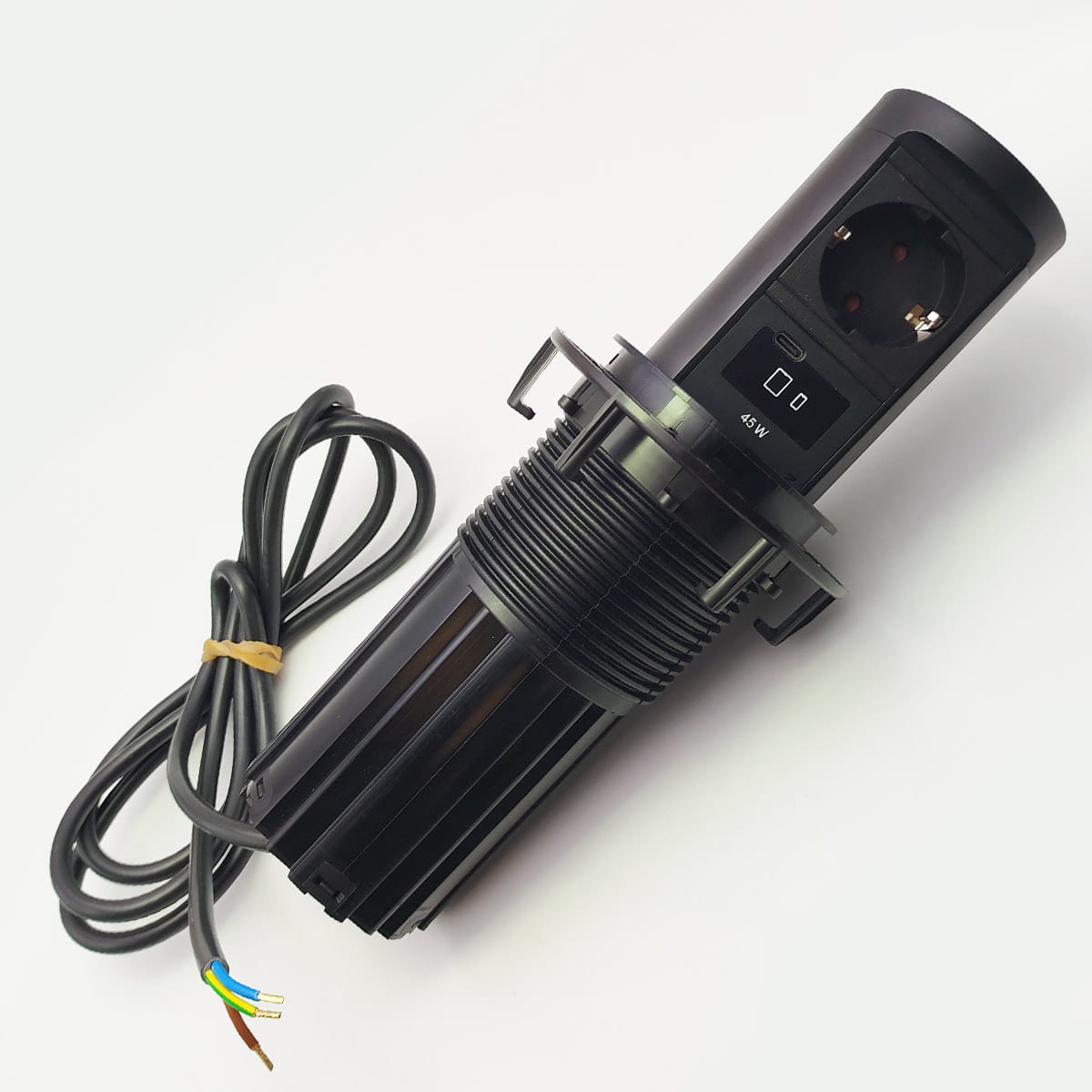 Wbudowane gniazdo Bachmann ELEVATOR 2 (BM0020509) to funkcjonalne połączenie klasycznego zasilania i ładowania bezprzewodowego, zamknięte w stylowej obudowie o matowo-czarnym wykończeniu. Oprócz gniazda z uziemieniem CEE 7/3 wyposażone jest w port USB-C o mocy 45 W oraz ładowarkę bezprzewodową Qi2 kompatybilną z MagSafe. Dzięki mechanizmowi cichego otwierania moduł wysuwa się z blatu po lekkim naciśnięciu i równie płynnie się chowa.