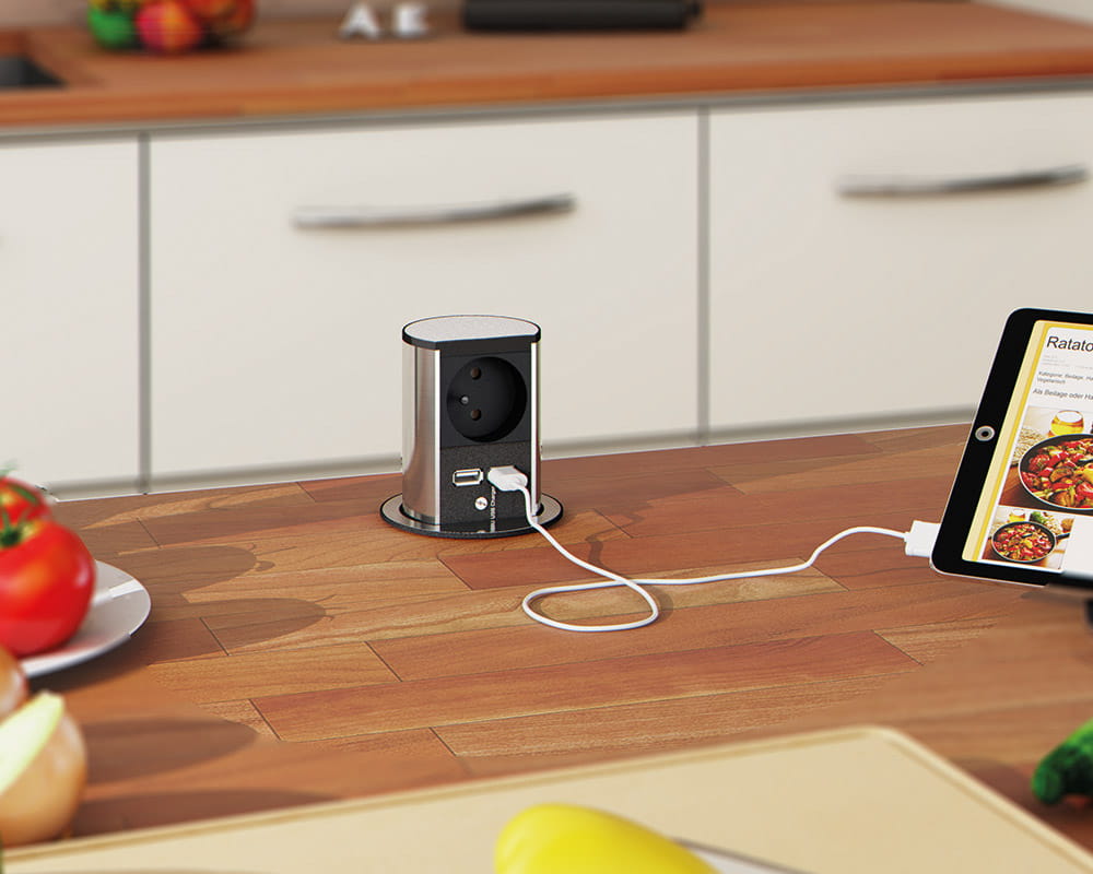 ✅ Estetyka i funkcjonalność – gniazdo chowa się w blacie, dzięki czemu nie zaburza wyglądu biurka czy stołu.
