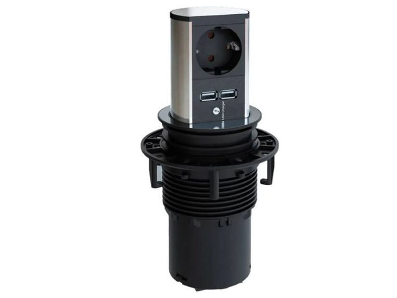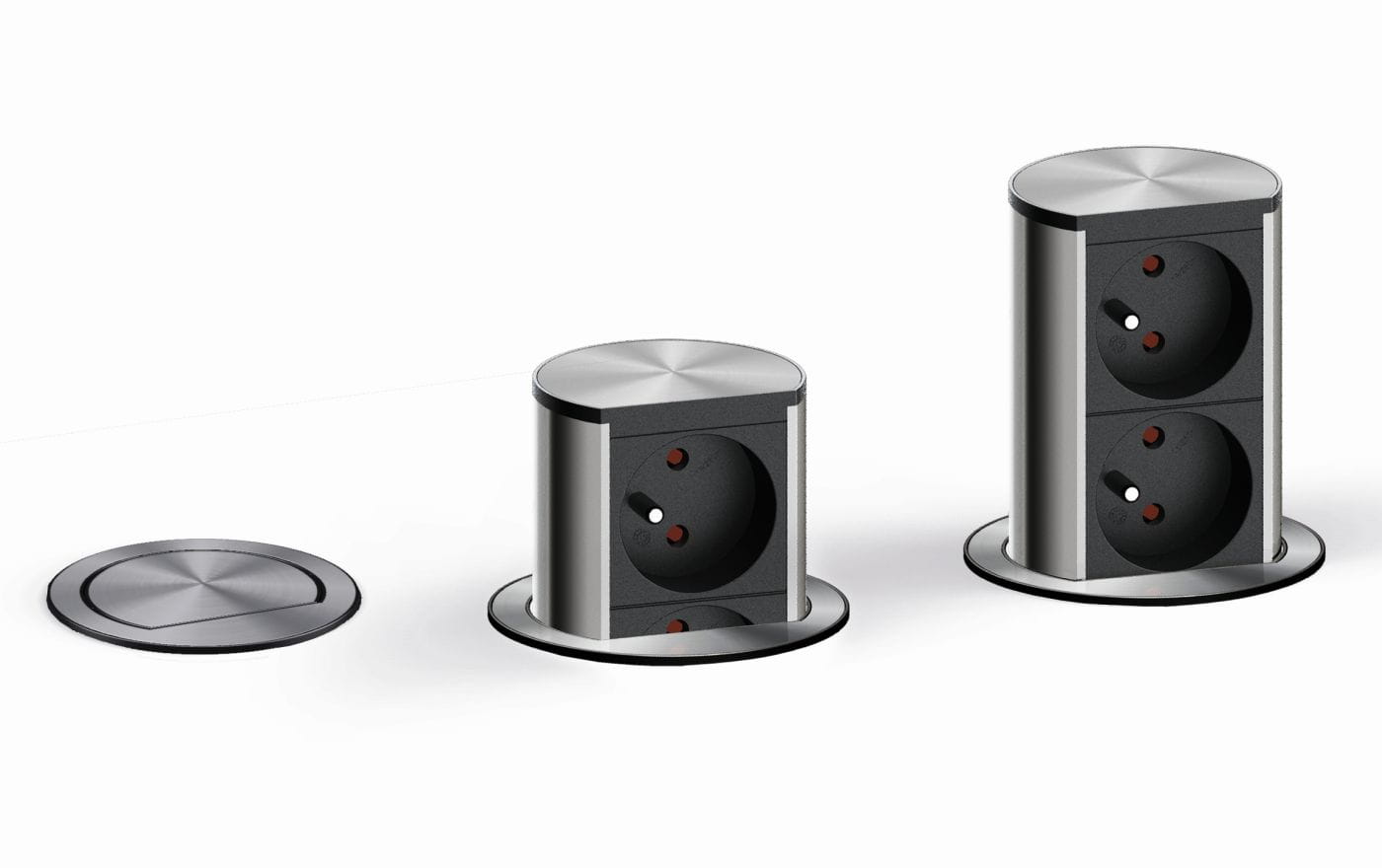 ELEVATOR dostępny jest w dwóch wariantach: z dwoma gniazdami zasilającymi lub z jednym gniazdem zasilania i dwoma gniazdami sieciowymi. Jego montaż jest wyjątkowo prosty – wystarczy umieścić go w otworze o średnicy ø79 mm i zabezpieczyć od spodu za pomocą pierścienia blokującego.