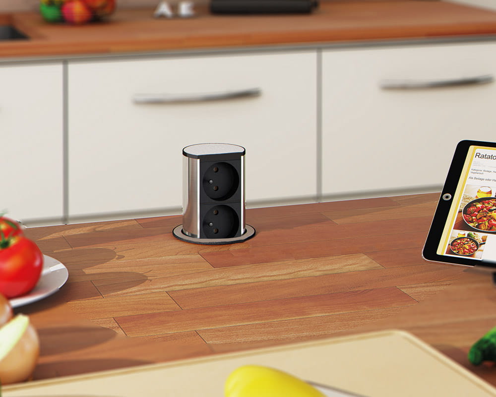 - Gniazdo jest wpuszczane w blat, a jego powierzchnia licuje z powierzchnią stołu, zapewniając estetyczny wygląd.