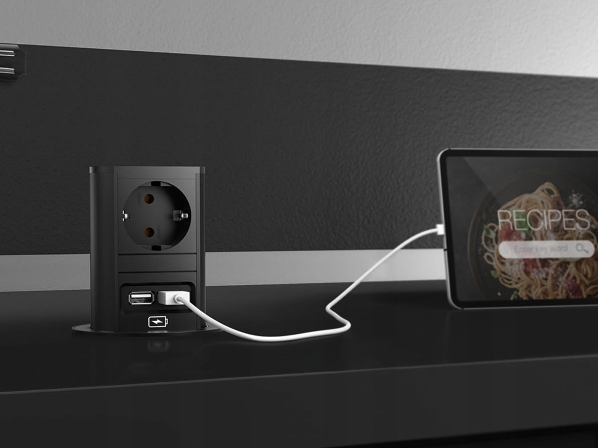 ✅ Estetyka i funkcjonalność – gniazdo chowa się w blacie, dzięki czemu nie zaburza wyglądu biurka czy stołu.