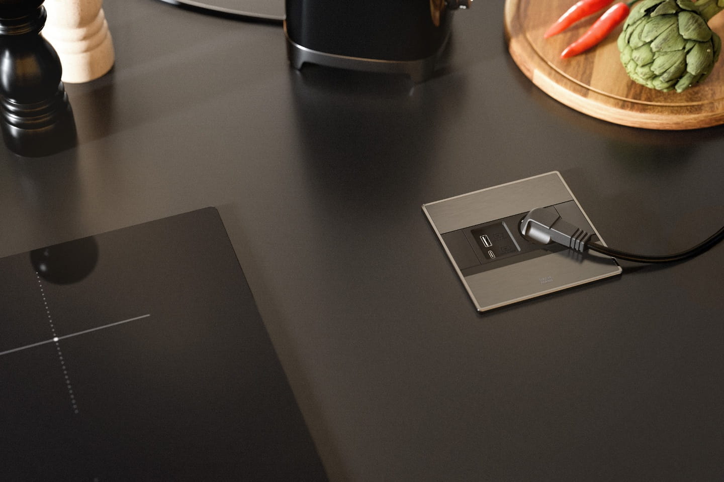 Obudowa wykonana jest z trwałych materiałów (tworzywo + metalowa pokrywa w czarnym, szczotkowanym wykończeniu), co nadaje całości nowoczesny, minimalistyczny wygląd i dobrą odporność na codzienne użytkowanie. Dzięki niewielkim wymiarom (ok. 129 × 129 mm) i płytkiej konstrukcji, gniazdo można łatwo zamontować nawet w ograniczonej przestrzeni – np. w blatach nad szufladami.
