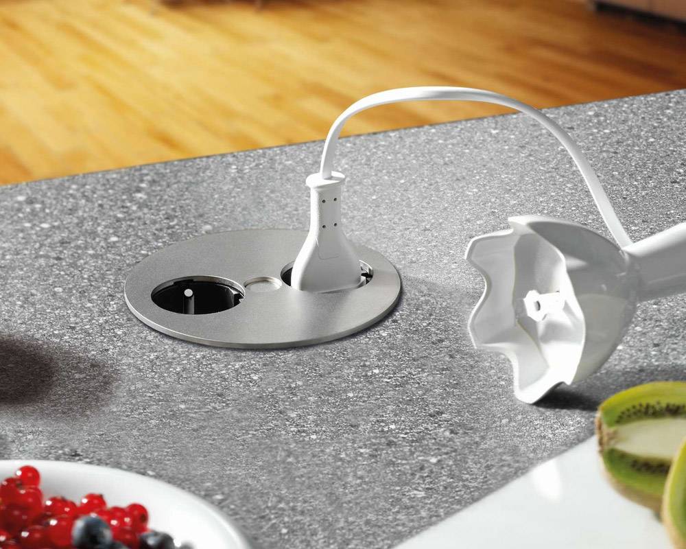 BACHMANN listwa zasilająca TWIST dzięki kompaktowym wymiarom i niewielkiej głębokości montażu można je łatwo zintegrować z blatem biurka lub kuchennym. Kabel zasilający poprowadzono blisko obudowy, a głębokość instalacji wynosi jedynie około 40 mm, co pozwala na montaż nawet nad szufladami. Po zakończeniu użytkowania wystarczy obrócić pokrywę, aby ukryć gniazdka.
