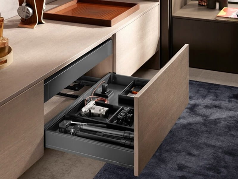 System AMPEROS AC doskonale współpracuje z rozwiązaniami firmy BLUM, takimi jak BLUMOTION, TIP-ON BLUMOTION oraz SERVO-DRIVE, a także może być montowany w szufladach systemów MOVENTO i LEGRABOX, grubość dna 12-32mm.