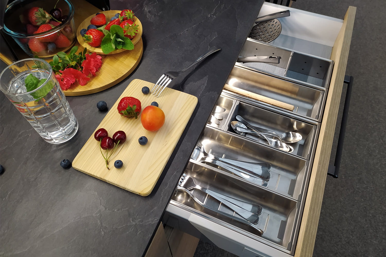 ORGA-LINE to elastyczny system podziału wewnętrznego szuflad. Pozwala optymalnie wykorzystać przestrzeń i zachować porządek. Składa się z wyjmowanych pojemników i przegródek ze stali nierdzewnej (INOX) łączonej z tworzywem sztucznym odpornym na zarysowania. Pojemniki można myć w zmywarce.