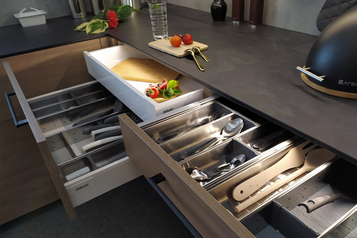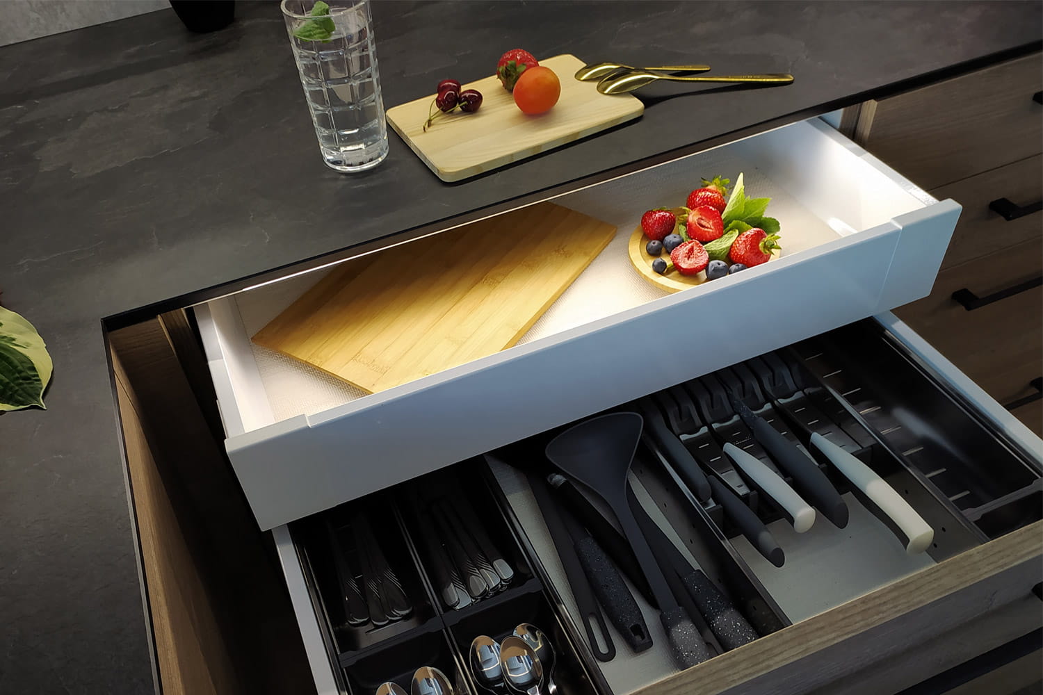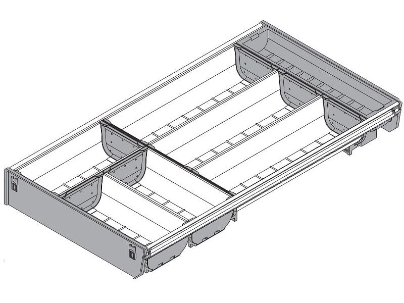 - Rodzaje podziału szuflady: Wkład z pojemnikami