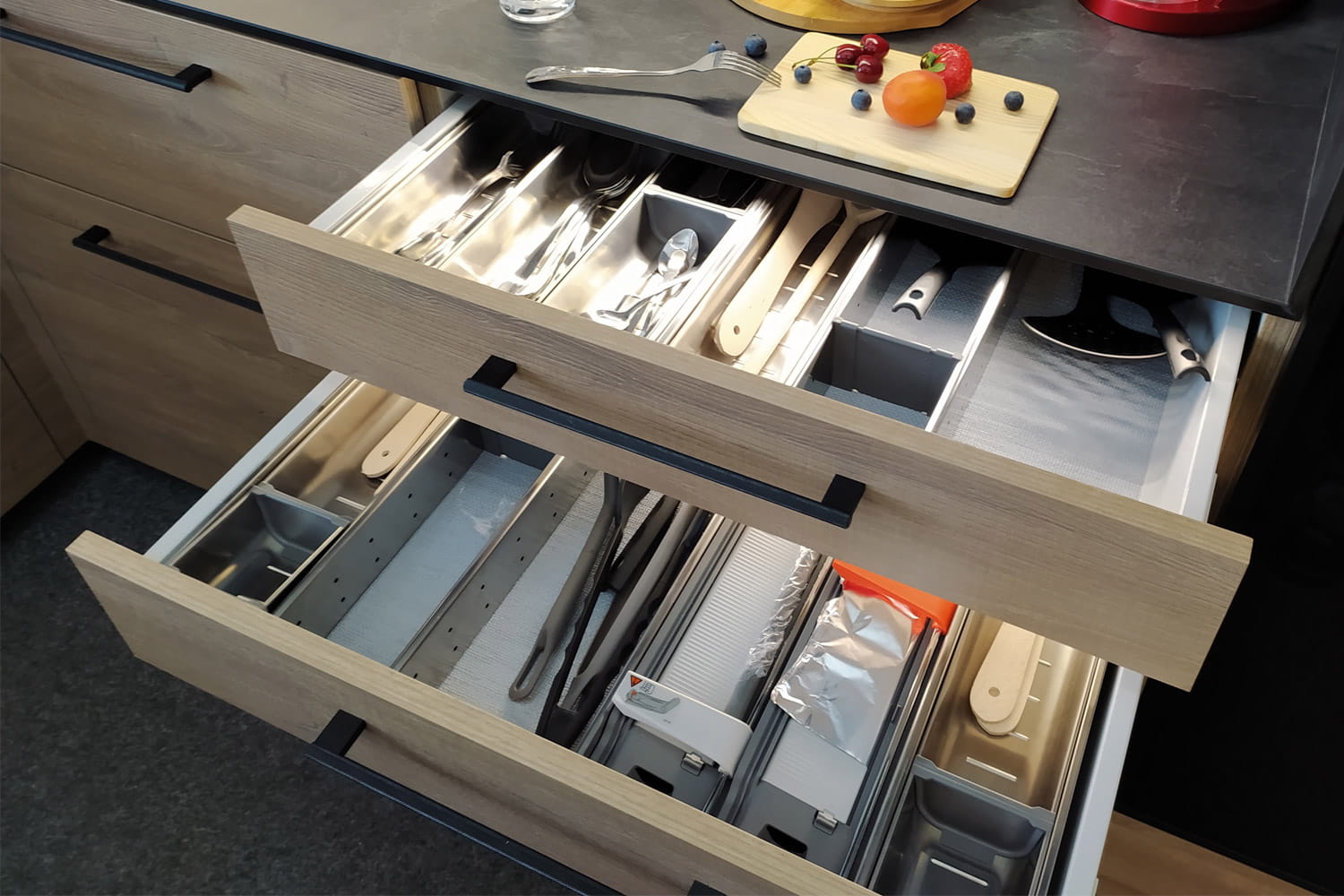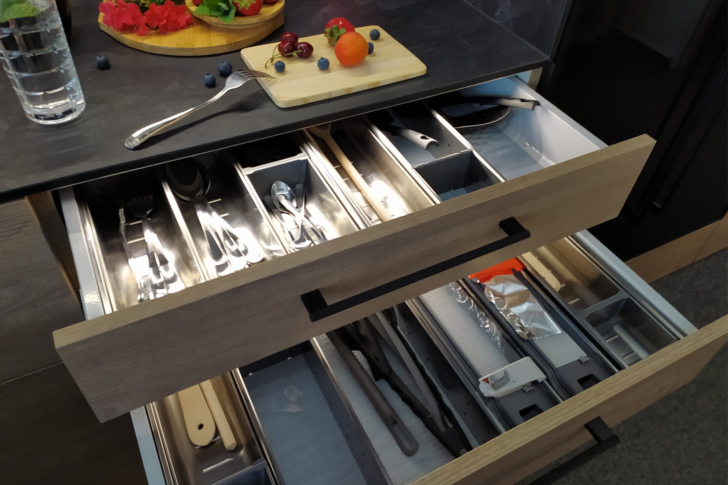- Rodzaje podziału szuflady: Wkład z pojemnikami