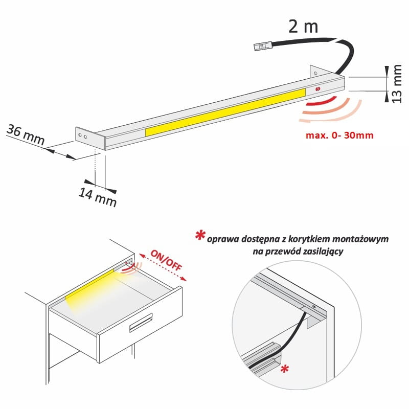 W zestawie znajduje się korytko prowadzące przewód zasilający, które skutecznie go maskuje i chroni przed uszkodzeniami. Oprawa działa na bezpiecznym napięciu 12 V DC i posiada 2-metrowy przewód zakończony wtyczką typu minikonektor, co znacznie ułatwia podłączenie do zasilacza LED.