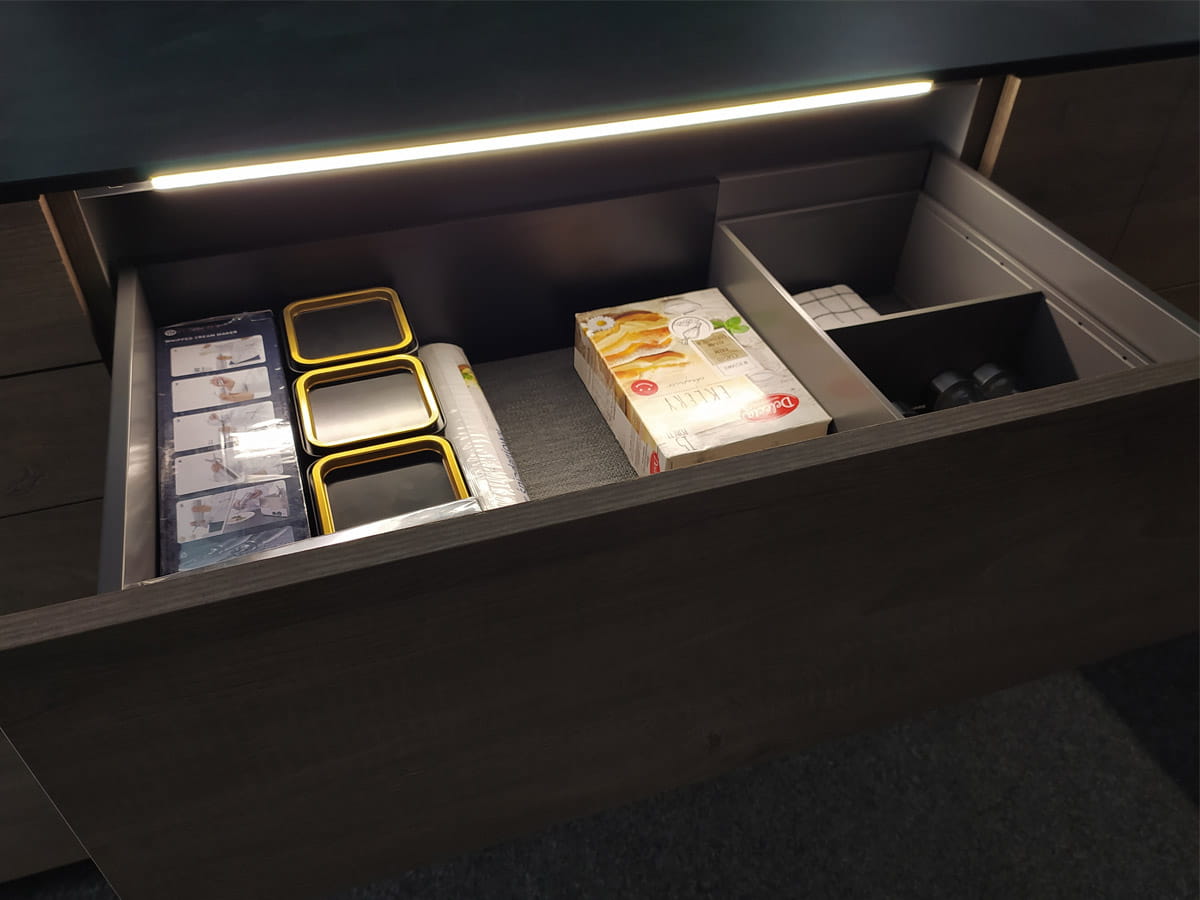 Polarus to nowoczesna oprawa LED o mocy 7W i długości 764 mm do szuflad, wyposażona w inteligentny wyłącznik zbliżeniowy, który włączy oświetlenie po otwarciu szuflady i wyłączy zaraz po jej zamknięciu. Oprawa uzbrojona jest w wydajne diody typu 2835 klasy Premium, które zapewniają idealne oświetlenie szuflad zarówno płytkich, jak i głębokich przy pełnym wysuwie.