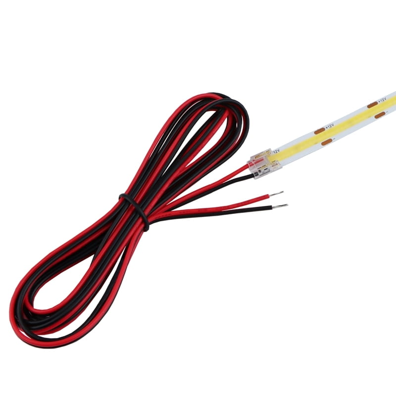 Uniwersalna złączka do taśm LED SMD i COB 8/10 mm z przewodem 2 m. Nowoczesna złączka LED, przeznaczona do taśm o szerokości 8 mm i 10 mm. Dzięki swojej uniwersalnej konstrukcji pasuje zarówno do taśm LED COB, jak i SMD, co sprawia, że jest wszechstronnym rozwiązaniem do różnych instalacji oświetleniowych. Idealna do szybkiego i wygodnego podłączenia taśm LED bez konieczności lutowania.