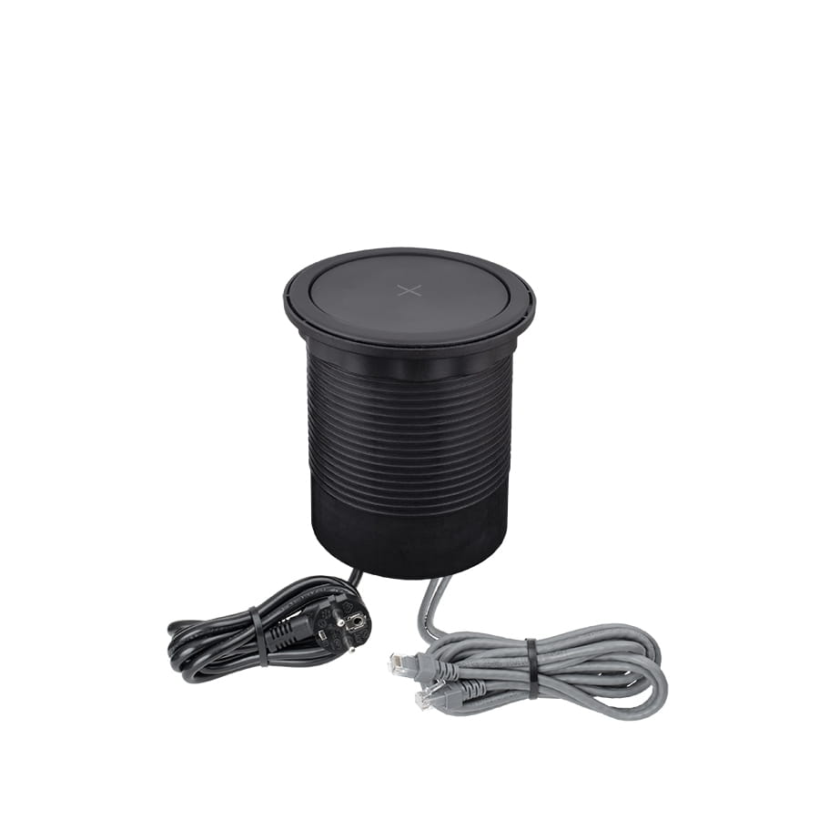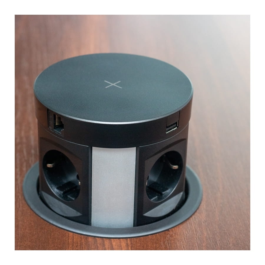 Jest to bardzo funkcjonalne rozwiązanie – wpuszczone w blat, doskonale licuje się z jego powierzchnią. W górnej części znajduje się wbudowana ładowarka indukcyjna, umożliwiająca ładowanie telefonu bez potrzeby podłączania kabli. Aby skorzystać z dodatkowych gniazd, wystarczy nacisnąć obudowę, a panel wysunie się, oferując dostęp do dodatkowych portów. Dzięki temu można w wygodny sposób podłączyć lub naładować urządzenia, takie jak mikser, laptop czy smartfon. Porty RJ45 umożliwiają także podłączenie urządzeń do sieci.