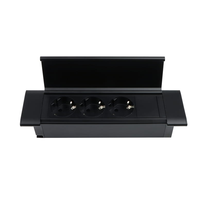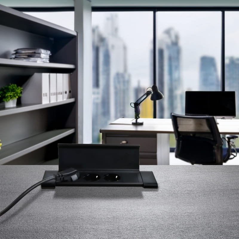 Dzięki swojej konstrukcji urządzenie pozwala na wygodne podłączanie dodatkowych sprzętów, takich jak laptop, monitor, drukarka czy smartfon – wystarczy unieść obudowę, aby uzyskać dostęp do gniazd. Niewielka wysokość wynosząca zaledwie 39 mm sprawia, że gniazdo jest wyjątkowo dyskretne i nie zaburza estetyki blatu.