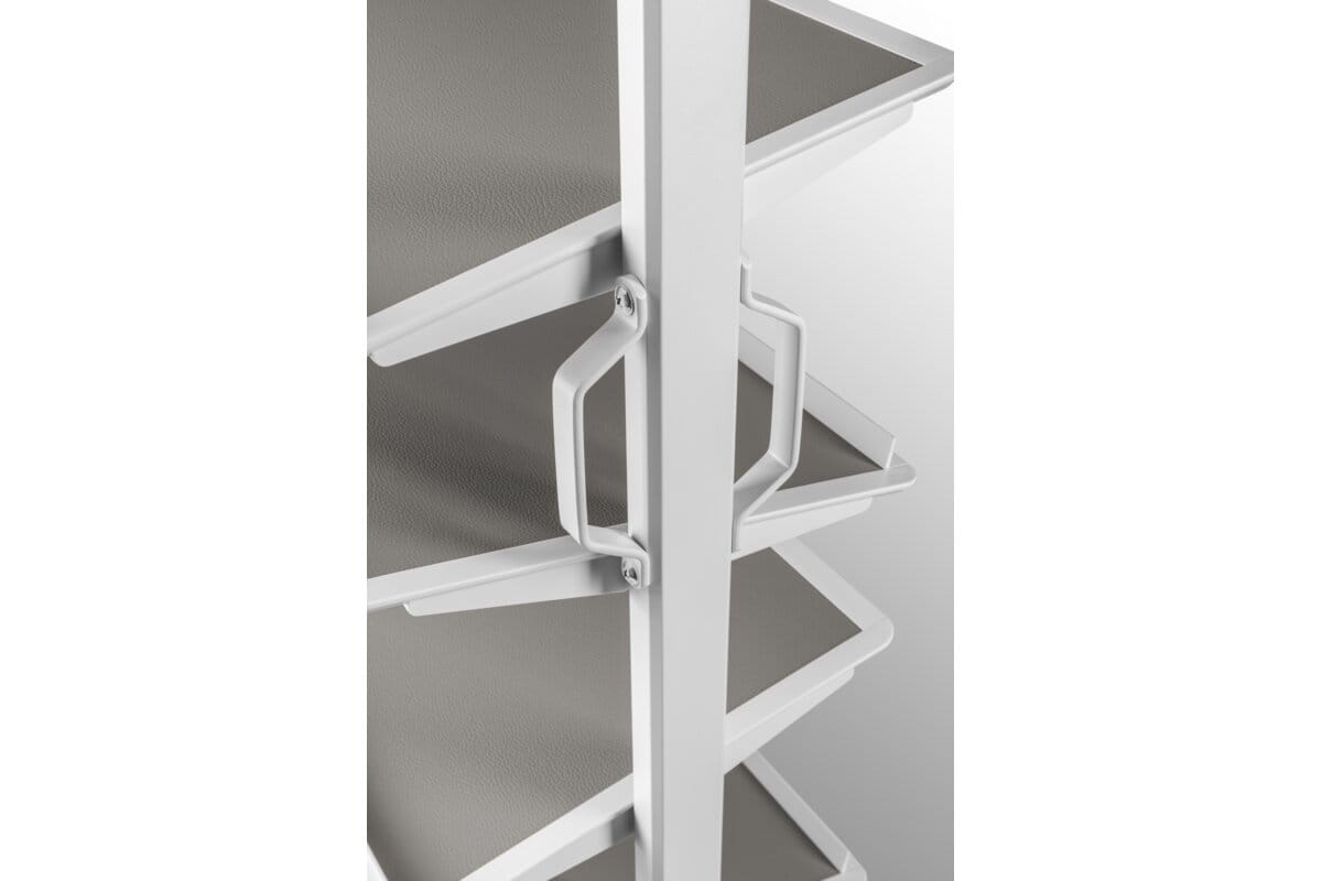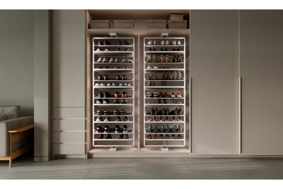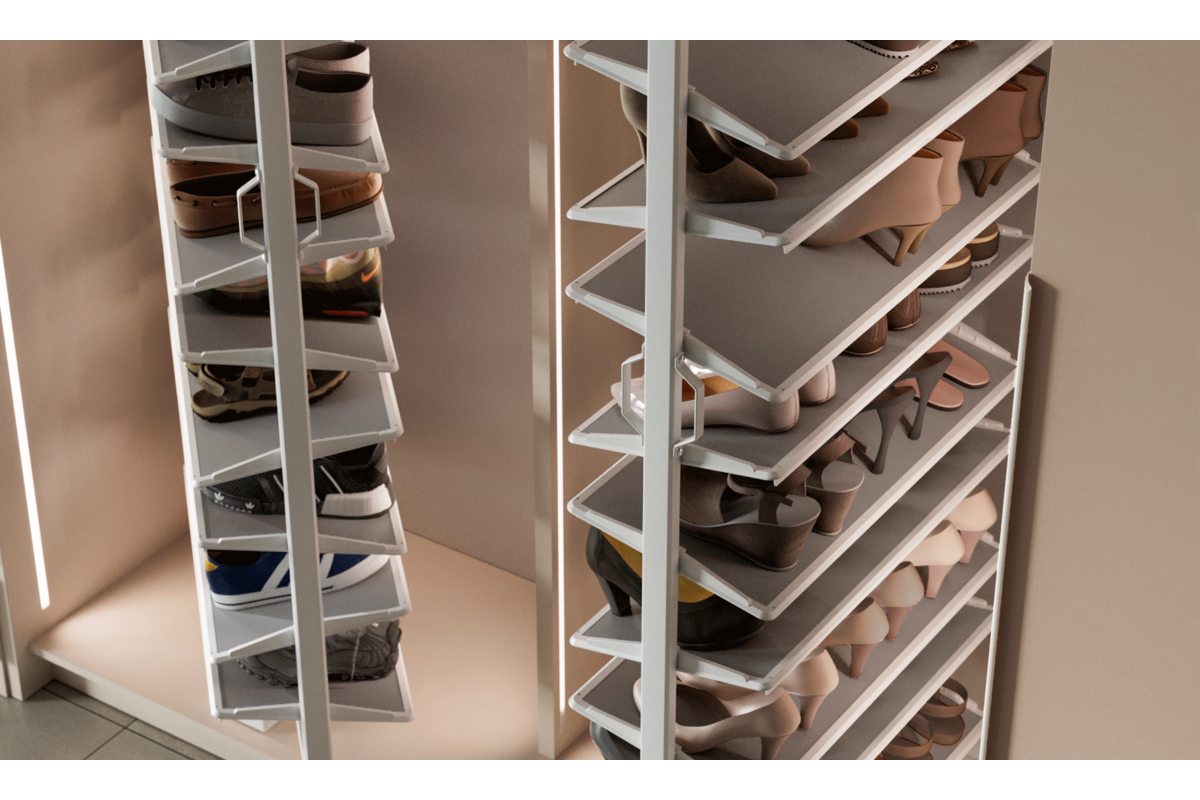 System obrotowych półek na buty GTV Elite przeznaczony jest do montażu wewnątrz szaf oraz garderób. Wyposażono go w wygodną, ergonomiczną rączkę, która ułatwia chwytanie i wysuwanie półki. Mechanizm obrotu o 180° zapewnia swobodny i pełny dostęp do przechowywanego obuwia.