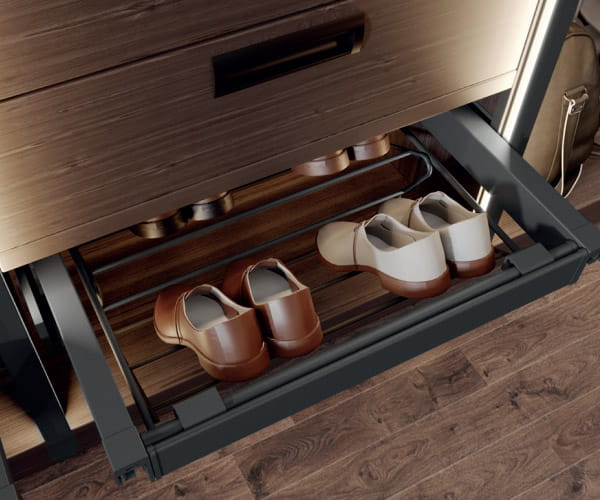 Szuflady z cichym domykiem W nowej garderobie Elite znajdziesz szuflady z trzema rodzajami koszy do wyboru: metalowym, rattanowym i ażurowym. Różnorodność tych elementów pozwoli Ci na dowolne aranżacje. Wszystkie szuflady są wyposażone w mechanizm cichego domykania oraz pełny wysuw, które gwarantują codzienny komfort użytkowania.