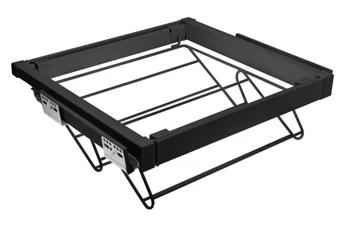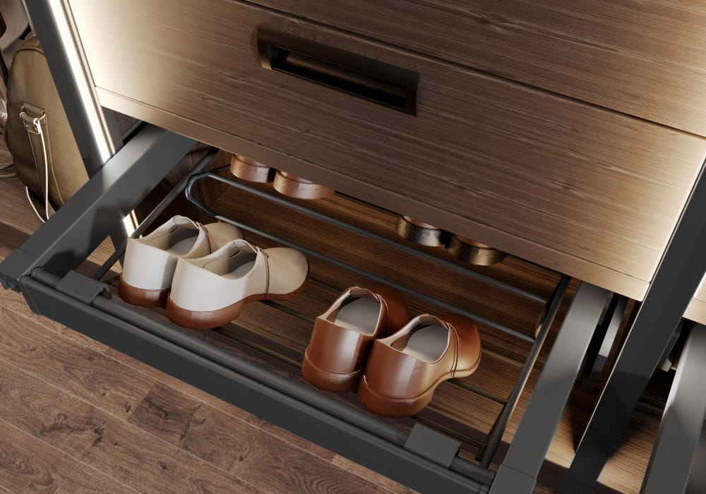 Ażurowa szuflada na buty ELITE doskonale sprawdzi się zarówno w szafie wolnostojącej, jak i w większej. Ułatwia utrzymanie porządku w domu i zapewnia butom długotrwałą ochronę. Szuflada dostępna jest w dwóch wersjach kolorystycznych oraz czterech rozmiarach, które można dopasować do szerokości korpusu. Dzięki technologii cichego domyku oraz pełnemu wysuwowi, codzienne użytkowanie staje się wygodne i komfortowe. W zestawie znajdują się: dwie dolne prowadnice montażowe, dwie osłony prowadnic, dwa uchwyty do mocowania koszyka, stelaż o regulowanej szerokości (± 58 mm), kosz druciany, kosz ażurowy oraz śruby.