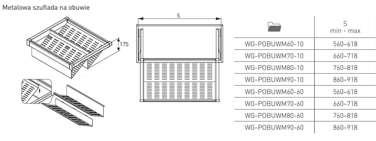 Metalowa szuflada ELITE na buty sprawdzi się zarówno w szafie wolnostojącej, jak i w większej szafie wnękowej. Umożliwia utrzymanie porządku w mieszkaniu oraz dba o odpowiedni stan obuwia. Szuflada dostępna jest w dwóch wersjach kolorystycznych i czterech rozmiarach, z możliwością dopasowania szerokości. Cicha technologia zamykania oraz pełny wysuw sprawiają, że codzienne korzystanie z szuflady jest wyjątkowo wygodne. Zestaw zawiera dwie dolne prowadnice montażowe, dwie osłony prowadnic, dwa uchwyty do kosza, ramę z regulowaną szerokością (+/- 58 mm), metalowy kosz oraz śruby montażowe.