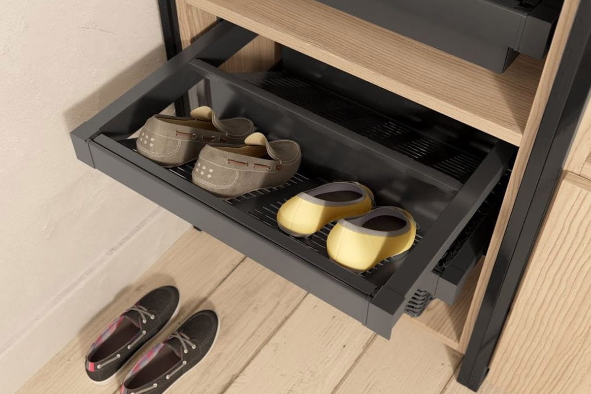 Metalowa szuflada ELITE na buty sprawdzi się zarówno w szafie wolnostojącej, jak i w większej szafie wnękowej. Umożliwia utrzymanie porządku w mieszkaniu oraz dba o odpowiedni stan obuwia. Szuflada dostępna jest w dwóch wersjach kolorystycznych i czterech rozmiarach, z możliwością dopasowania szerokości. Cicha technologia zamykania oraz pełny wysuw sprawiają, że codzienne korzystanie z szuflady jest wyjątkowo wygodne. Zestaw zawiera dwie dolne prowadnice montażowe, dwie osłony prowadnic, dwa uchwyty do kosza, ramę z regulowaną szerokością (+/- 58 mm), metalowy kosz oraz śruby montażowe.