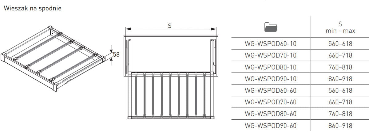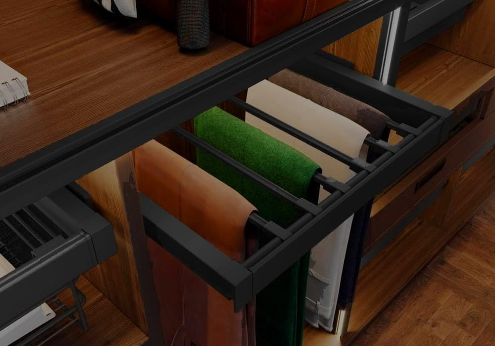 Szuflada wieszakowa ELITE to doskonałe rozwiązanie do przechowywania spodni, które zapewnia porządek i wygodę użytkowania. Dzięki licznym przegródkom jest bardzo funkcjonalna, a jej szerokość można dopasować do indywidualnych potrzeb. Dostępna w trzech wersjach kolorystycznych oraz czterech rozmiarach. Cicha technologia zamykania oraz pełny wysuw sprawiają, że codzienne korzystanie z szuflady jest wygodne i komfortowe. Zestaw zawiera dwie dolne prowadnice montażowe, dwie osłony prowadnic, dwa uchwyty kosza, regulowaną ramę o szerokości +/- 58 mm, pręty druciane (w liczbie 6, 7, 8 lub 9 w zależności od wybranego rozmiaru) oraz niezbędne śruby.