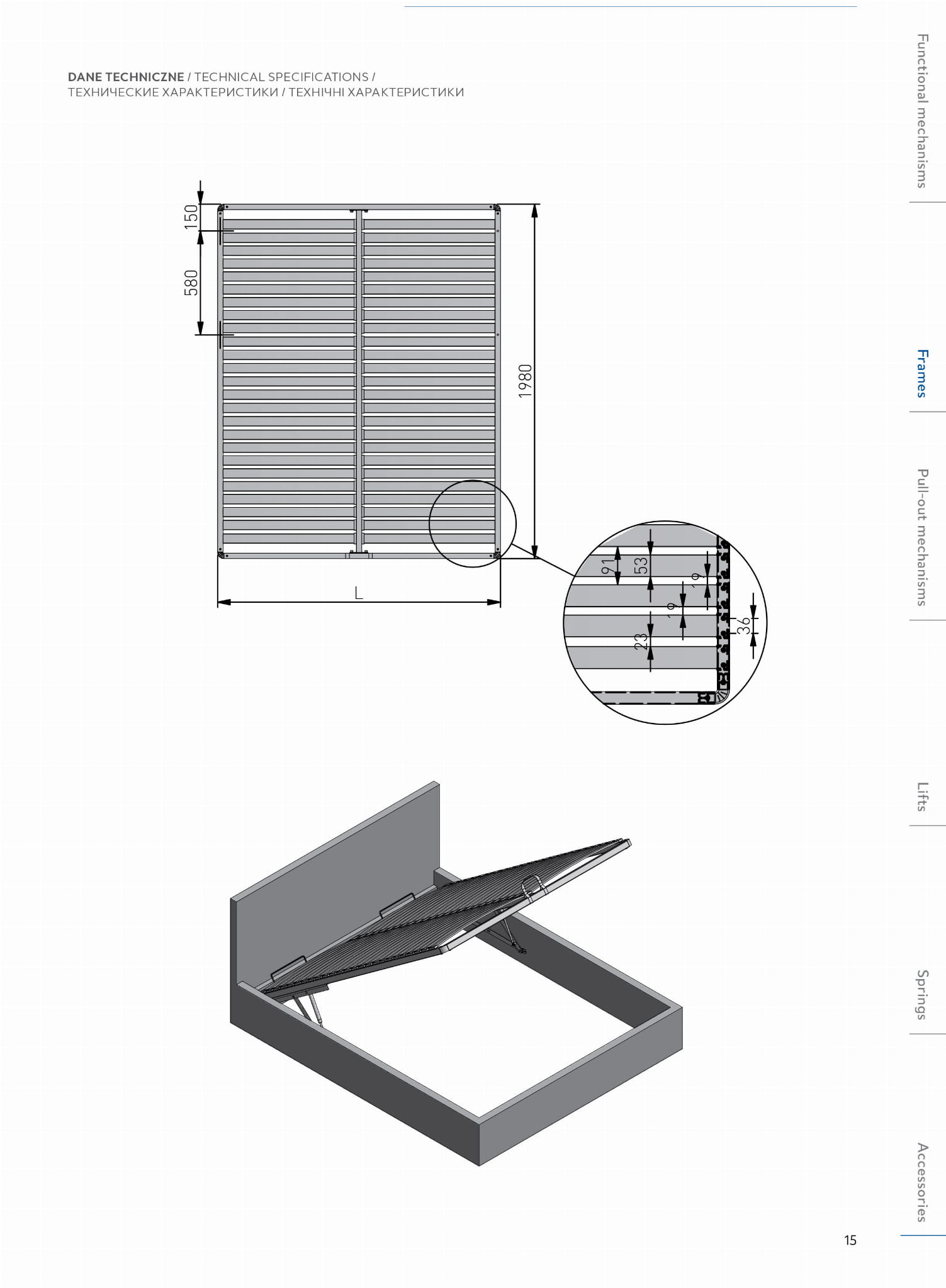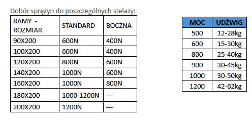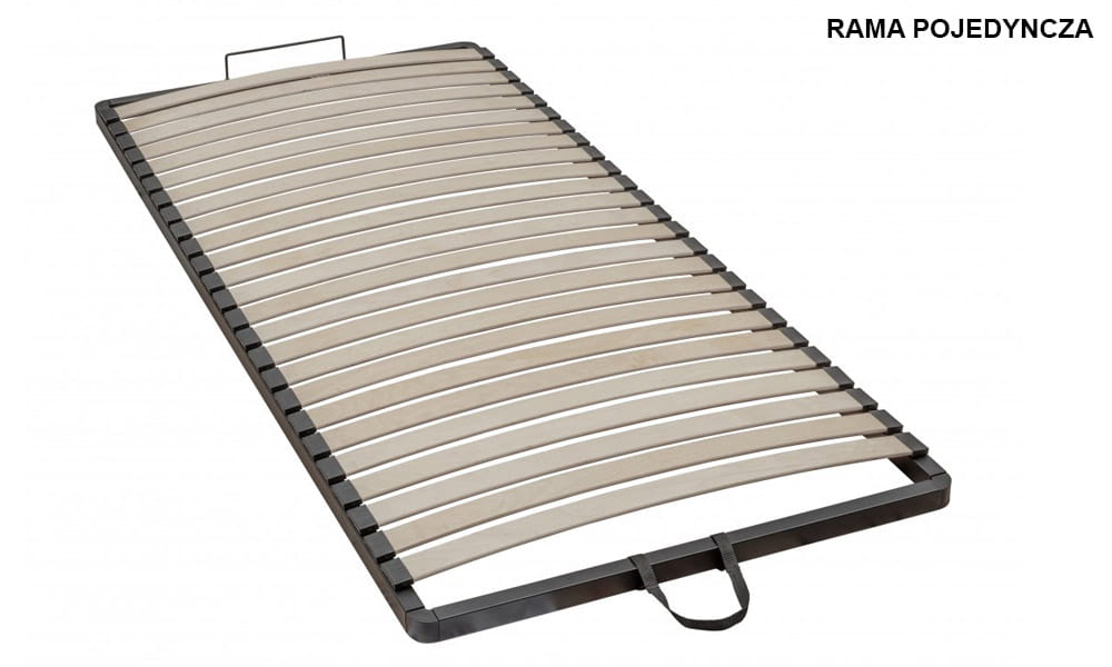 Podstawą łóżka sypialnianego jest solidna rama metalowa z drewnianymi listwami sprężynującymi, zapewniająca wygodę podczas snu. Wykonana z trwałego materiału, posiada stabilne połączenia i praktyczne detale. Dzięki profilowi 40x30x1,5 mm i wykorzystaniu naroży z tworzywa sztucznego, rama jest niezwykle wytrzymała. Montaż jest prosty, a listwy sprężynujące utrzymują materac w odpowiednim miejscu. W ramie znajdują się pręty zapobiegające opadaniu materaca podczas podnoszenia, co sprawia, że użytkowanie jest bezpieczne. W tylnej części ramy wspawane są dwa pręty, które zapobiegają opadaniu materaca podczas podnoszenia ramy. Otwieranie pionowe oraz boczne. Uchwyt z nylonu. Kolor ramy: czarny. Listwy wykonane z drewna naturalnego. W komplecie podnośnik PK-7-A-20 (prawy i lewy) i sprężyna gazowa o wybranej mocy (2 szt.).
