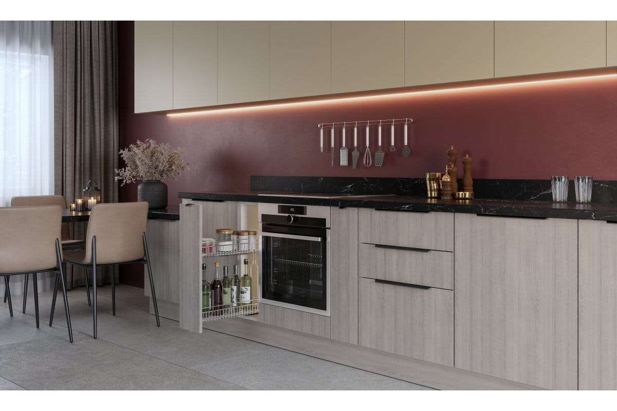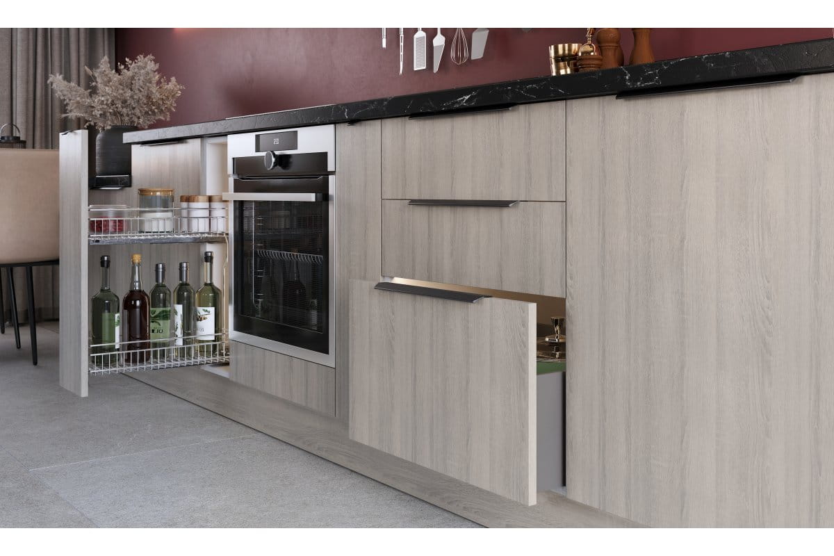 Minimalistyczna forma uchwytów TREX-CROSS pozwala na ich niemal niewidoczne zespolenie z wysokimi frontami meblowymi. Dzięki temu stanowią one dyskretny element całości, podkreślając charakter mebla bez przytłaczania jego formy. Doskonale wpisują się w nowoczesne przestrzenie, w których liczy się prostota, spójność i subtelny detal.