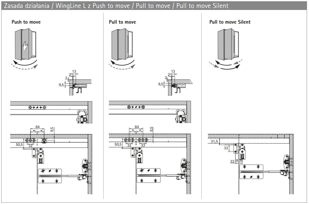 | Push to move Delikatne naciśnięcie na front powoduje automatyczne otwarcie się drzwi. Drzwi zamykane są ręcznie. | Pull to move Lekkie pociągnięcie za uchwyt powoduje samoczynne otwarcie się drzwi od kąta 1°. Drzwi zamykane są ręcznie. | Pull to move Silent Lekkie pociągnięcie za uchwyt powoduje samoczynne otwarcie się drzwi od kąta 35°. Otwarte drzwi wystarczy lekko popchnąć, aby zamknęły się miękko i delikatnie. |