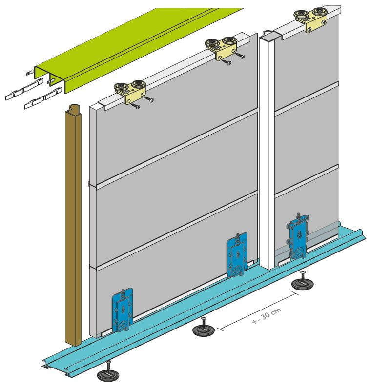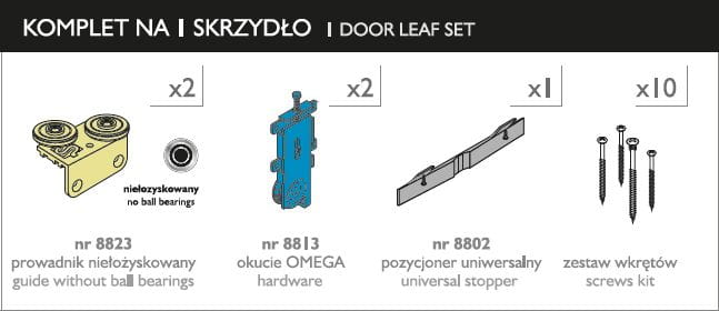 Komplet OMEGA to zestaw okuć montażowych do drzwi przesuwnych, z jednym skrzydłem drzwi.
