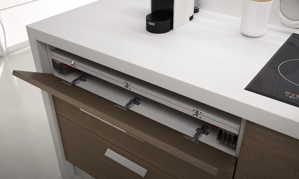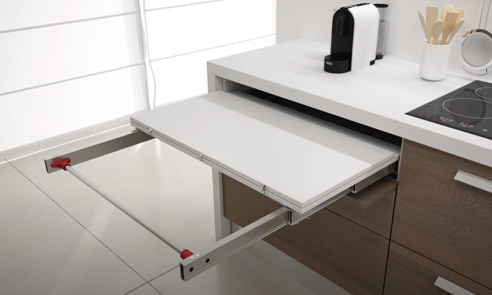 Mechanizm blatu LUNCH ten genialny projekt został opracowany w celu maksymalizacji oszczędności miejsca na mniejszych obszarach lub tam, gdzie wymagane jest środowisko bez bałaganu. Zaprojektowany tak, aby dobrze schować się za frontem szuflady, system ten po prostu wysuwa się i daje wybór szerokości stołu. Idealnie nadają się do małych kuchni, aneksów kuchennych, pralni, biur, sal zabaw i sypialni dla dzieci. Najnowsze aplikacje obejmowały również przyczepy kempingowe i przyczepy kempingowe. Dostępny w różnych szerokościach, ten system zapewni ci wysuwany blat o powierzchni ok. długości 900 mm. Nie ma potrzeby przechowywania dodatkowych elementów, rozszerzeń itp. W innym miejscu, ponieważ wszystko jest kompaktowo zaprojektowane w szufladzie i gotowe, aby po prostu otworzyć zawiasowy przód przestrzeni szuflady.