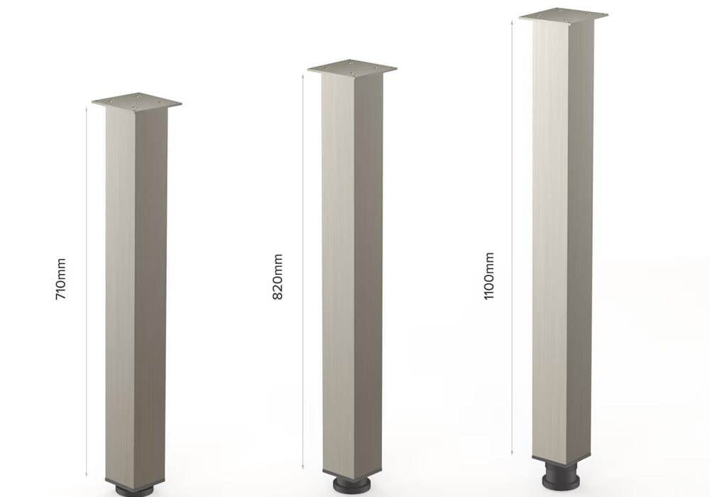 Elegancka i solidna noga o wysokiej jakości wykonania, z profilem kwadratowym 60 × 60 mm. Została wyprodukowana z aluminium o grubości ścianki 1,4 mm, co zapewnia jej dużą stabilność. W górnej części znajduje się centralnie zamocowana aluminiowa płytka o grubości 5 mm, wyposażona w cztery otwory montażowe. Maksymalne obciążenie nogi to 60 kg.