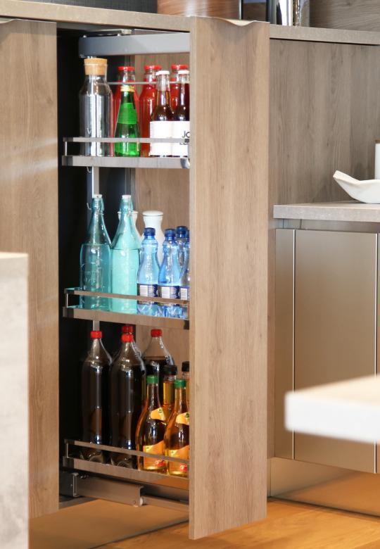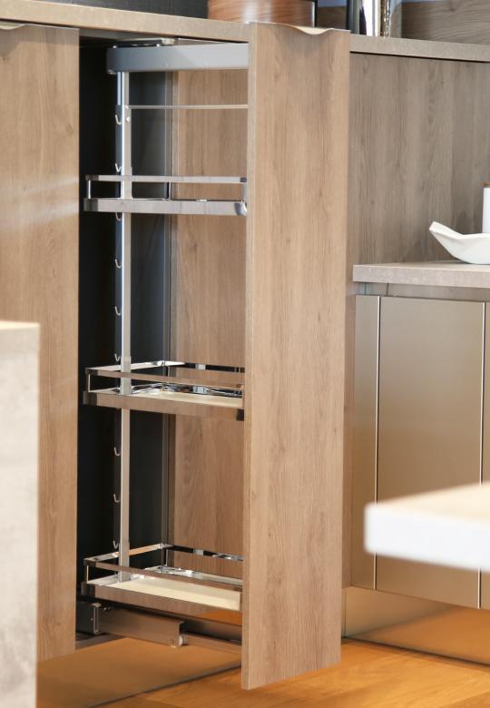 Wyciąg wysoki do szafki typu cargo o szerokości frontu 400 mm i wysokości ramy w przedziale 900-1200 mm. Prowadnica z pełnym wysuwem. Komplet dostępny jest z koszami w linii ARENA Style. Relingi wykonane są z chromowanych płaskich elementów. Drewniane dno koszy w kolorze biały, pokryte jest antypoślizgową przezroczystą powłoką. Koszyki można zawieszać na ramie w odległości co 10 cm. Wyciąg posiada system cichego domykania. W celu optymalnego funkcjonowania systemu zaleca się stosowanie hamulca Soft Stopp Pro 01.265.S, który wyhamuje cargo w momencie otwierania. W przypadku otwierania szafki bezuchwytowo należy osobno zamówić system elektryczny eTouch.