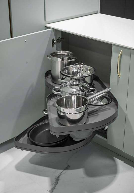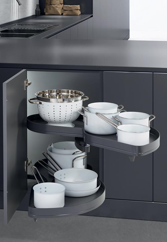 LeMans II to system meblowy, w którym dwie ruchome półki wysuwają się całkowicie z szafki, zapewniając łatwy i ergonomiczny dostęp do kuchennych akcesoriów. Wystarczy otworzyć front pod kątem 85°.