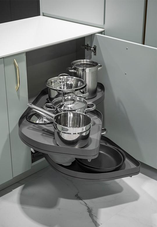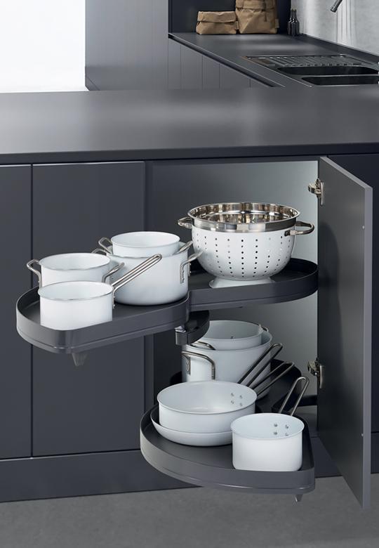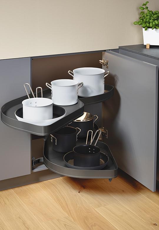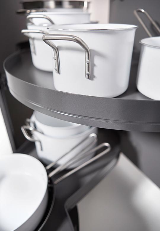 LeMans II to system meblowy, w którym dwie ruchome półki wysuwają się całkowicie z szafki, zapewniając łatwy i ergonomiczny dostęp do kuchennych akcesoriów. Wystarczy otworzyć front pod kątem 85°.