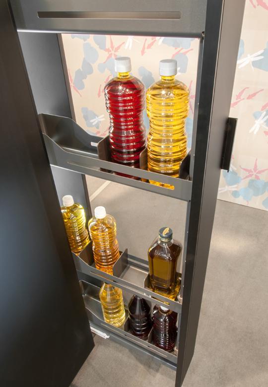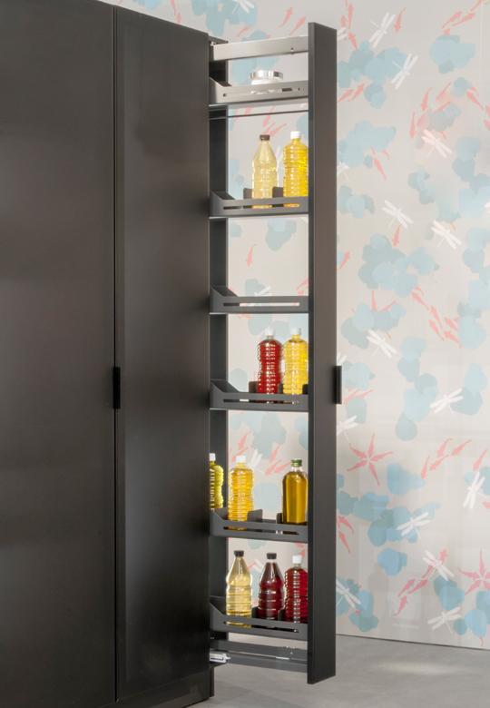 Wyciąg wysoki do szafki typu cargo o szerokości frontu 150 mm i wysokości ramy w przedziale 1900-2300 mm. Zastosowana prowadnica z 3/4 wysuwu. Komplet dostępny jest z koszami w linii Libell z matami antypoślizgowymi. Koszyki można zawieszać na ramie w odległości co 10 cm.