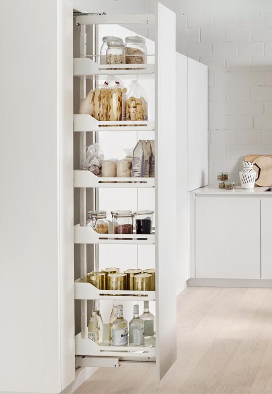 Wyciąg wysoki do szafki typu cargo o szerokości frontu 400 mm i wysokości ramy w przedziale 1900-2300 mm. Komplet dostępny jest z koszami w linii Libell z matami antypoślizgowymi. Koszyki można zawieszać na ramie w odległości co 10 cm. Prowadnica z pełnym wysuwem. Wyciąg posiada system cichego domykania. W celu optymalnego funkcjonowania systemu zaleca się stosowanie hamulca Soft Stopp Pro 01.265.S, który wyhamuje cargo w momencie otwierania. W przypadku otwierania szafki bezuchwytowo należy osobno zamówić system elektryczny eTouch.
