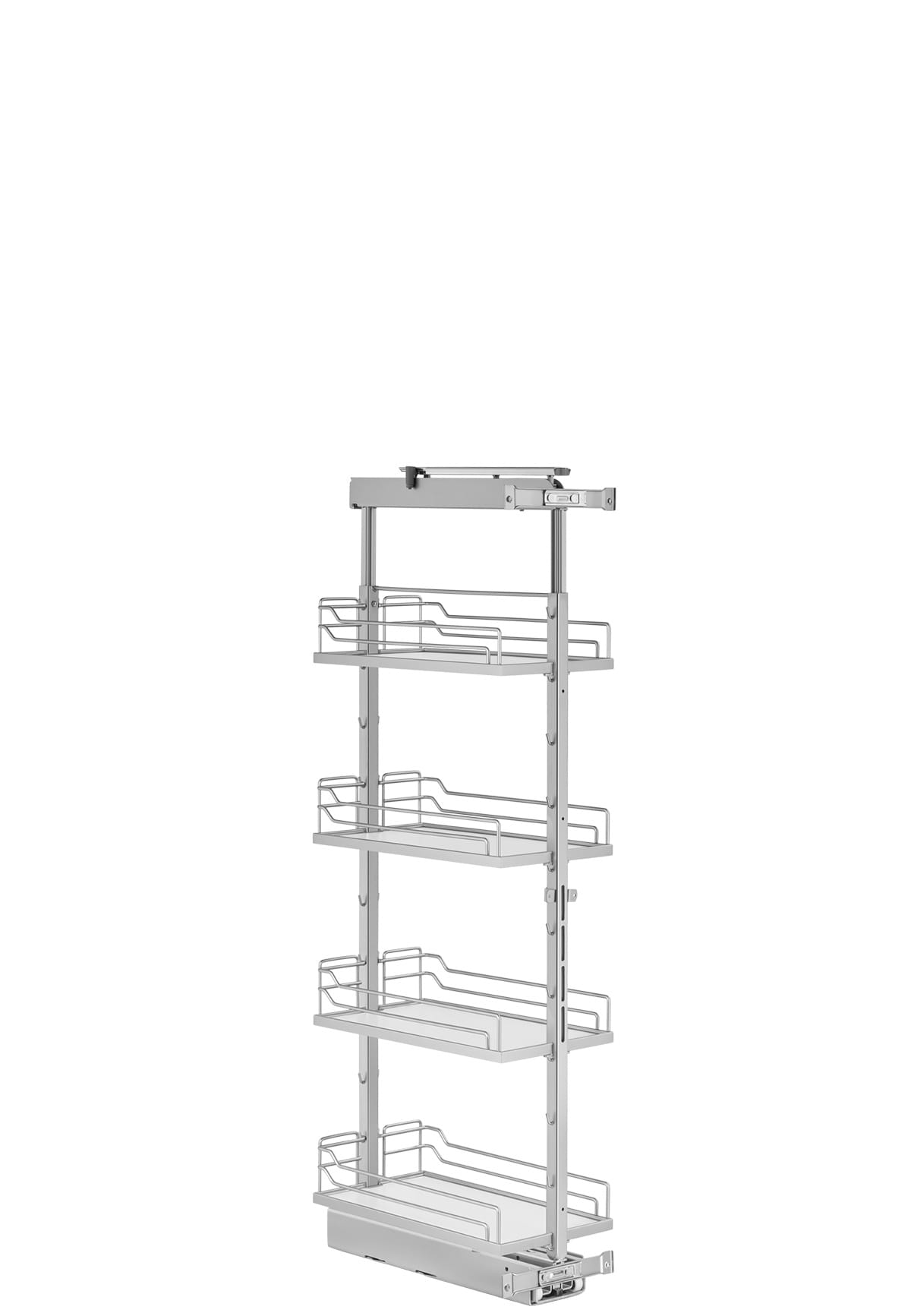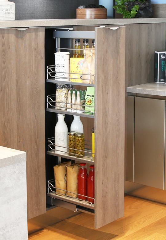 Cargo Dispensa 300 to wysokie cargo do słupka (do 300 mm szerokości), montowane do frontu i korpusu szafki. Po wysunięciu zapewnia wygodny dostęp z obu stron i dużą przestrzeń na zapasy – jak w domowej spiżarni, szczególnie praktyczne obok lodówki.