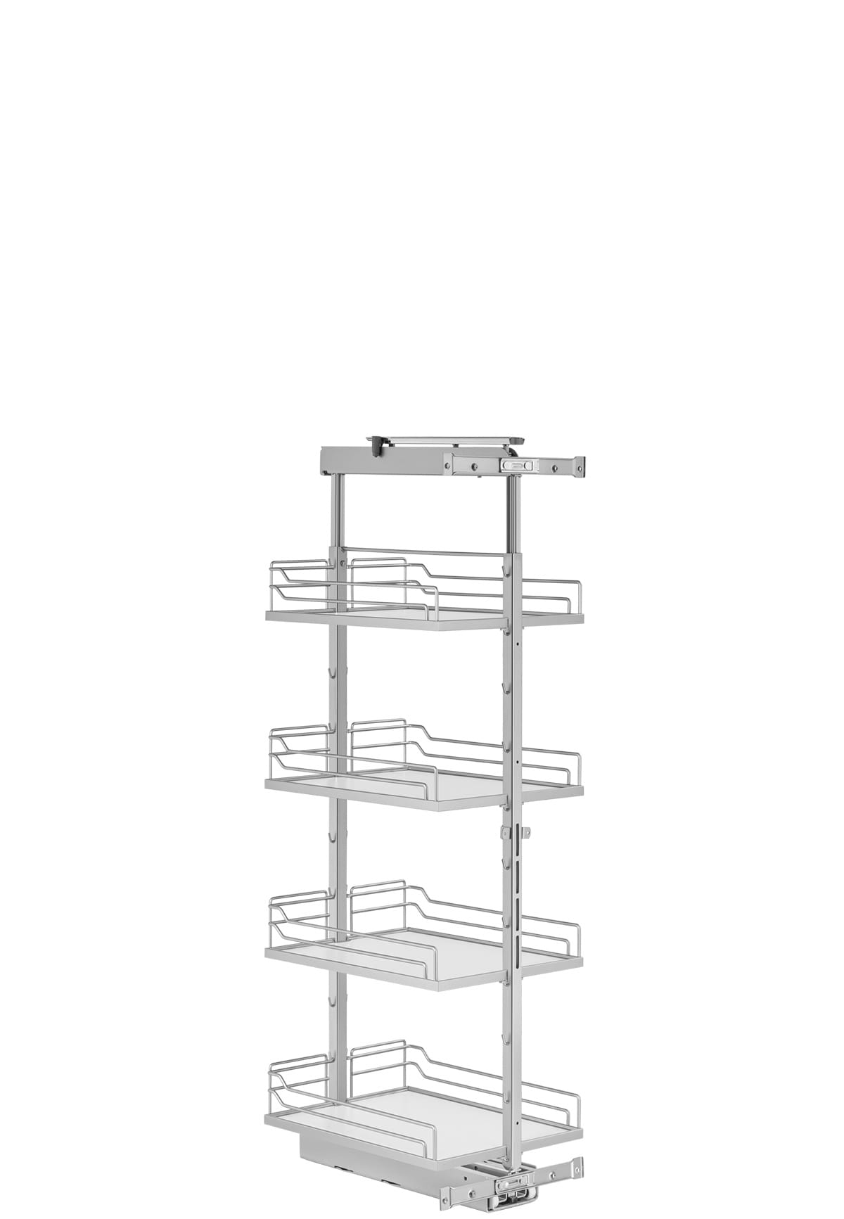 Cargo Dispensa 400 to wysokie cargo do słupka (do 400 mm szerokości). Montowane do frontu i korpusu szafki, zapewnia pełny wysuw i wygodny dostęp z obu stron. Pomieści dużo produktów i działa jak praktyczna domowa spiżarnia — szczególnie wygodne obok lodówki.