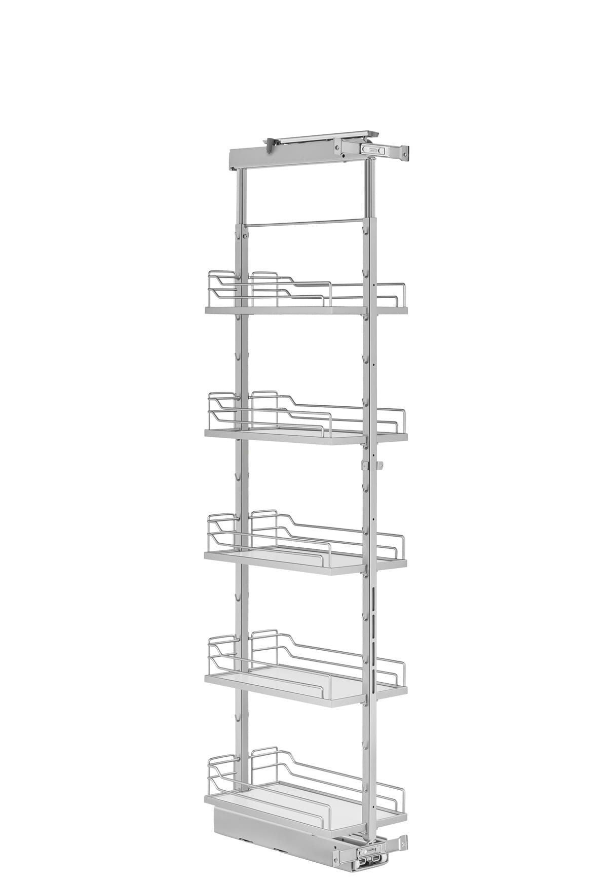 Cargo Dispensa 300 to wysokie cargo do słupka (do 300 mm szerokości). Montowane do frontu i korpusu szafki, zapewnia pełny wysuw i wygodny dostęp z obu stron. Pomieści dużo produktów i działa jak praktyczna domowa spiżarnia — szczególnie wygodne obok lodówki.